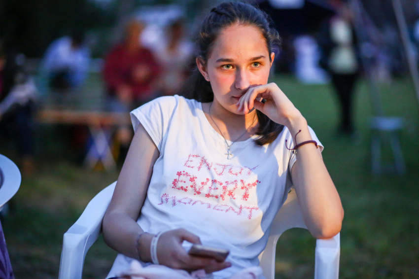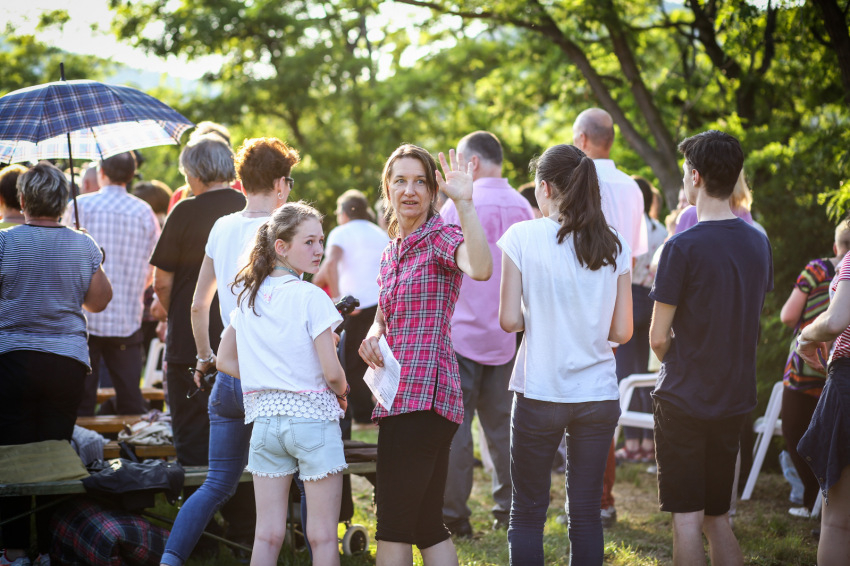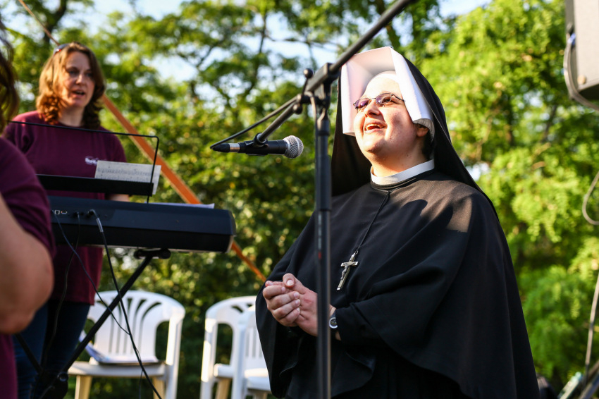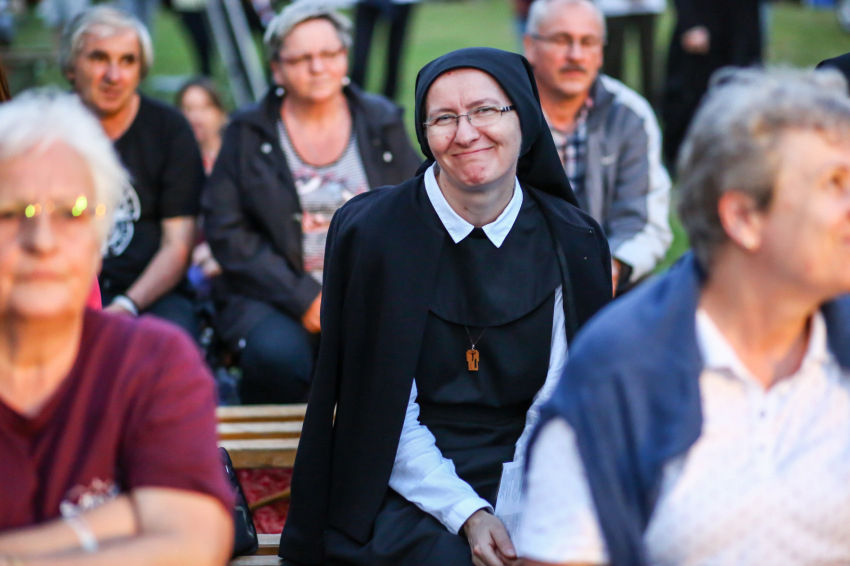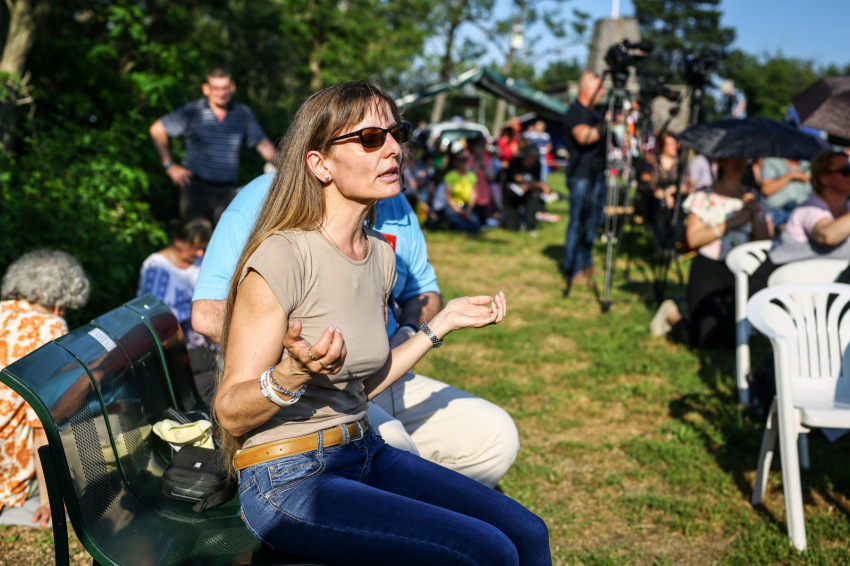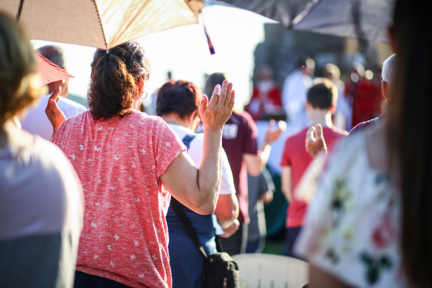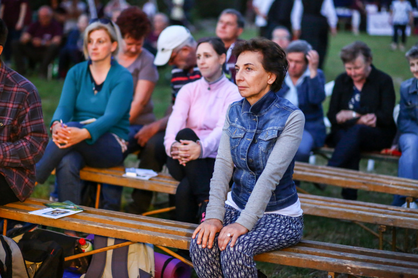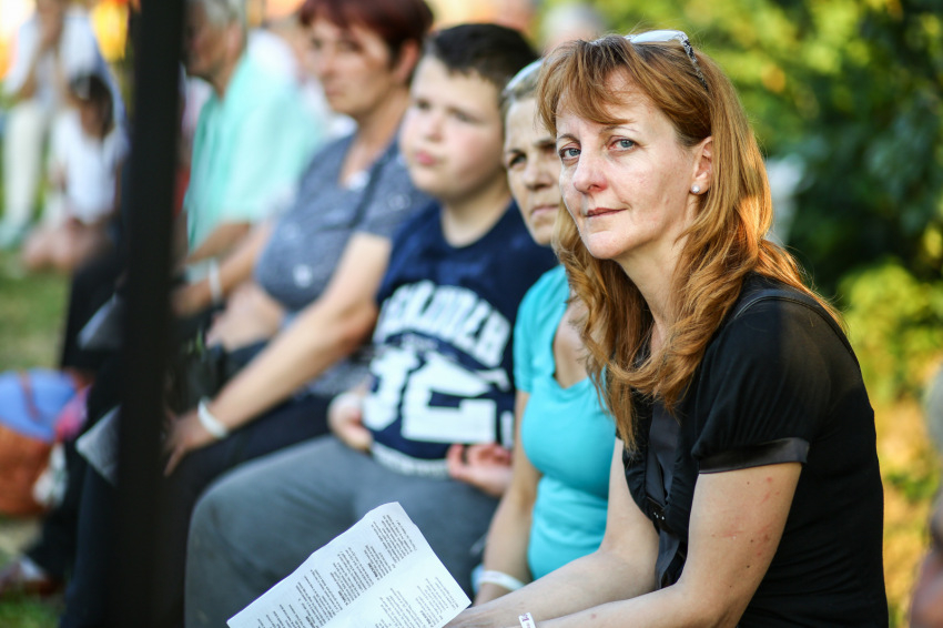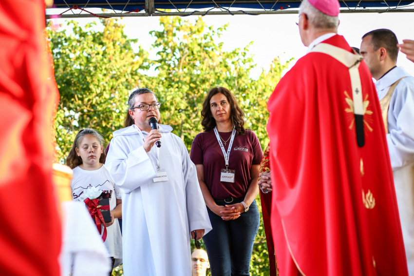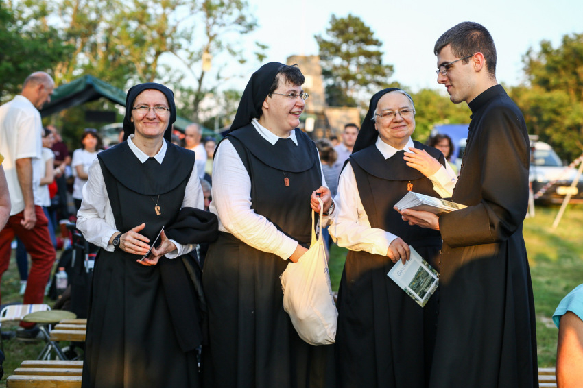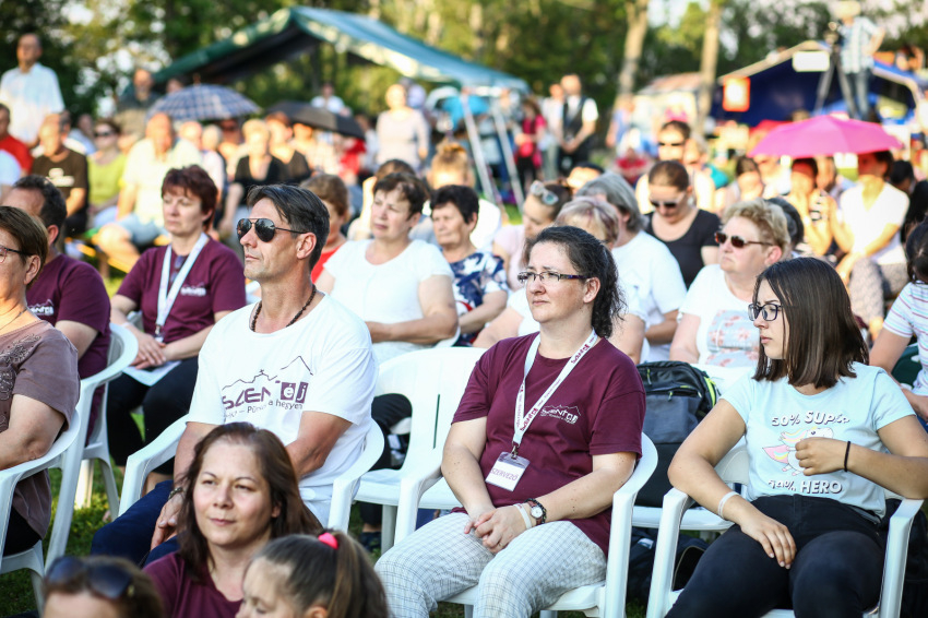Miközben a színpadon tanúságtételek kezdődnek, mi a kollégámmal a szervezői sátornál Kiss Nándorral, a közösség egyik tagjával beszélgetünk a hosszú útról, amely végül ide, a hegyre vezetett. A szentségimádások történetéről, amelyekbe az indiai Joseph Vadakkel atya buzdítására kezdtek bele a környék településein, Magyarország és a magyar fiatalok megtéréséért. Közösségük legfőbb ismertetőjele a testvéri szeretet, ahogyan az őskeresztény időkben lehetett; Nándor nagy családhoz hasonlónak látja magukat.