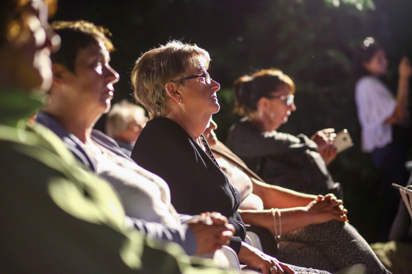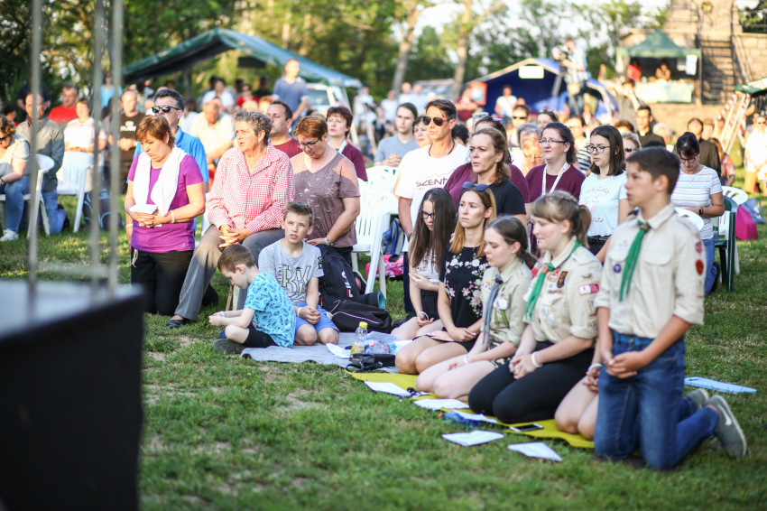 Odafent viszont kinyílik a tér, és csatlakozunk a Szent éj című program résztvevőihez. Nagy, füves területre érünk, az egyik végén országzászlóval, a másikon pici, szent koronás tetejű kápolnával, amely előtt most színpadot és oltárt állítottak. Innét köszönti az egybegyűlteket Szamosvölgyi Péter polgármester, és jó virrasztást kíván nekik. Megköszöni a programot szervező Hegyközi Karizmatikus Megújulás munkáját, és a keresztény hit fontosságáról beszél, amely mindig minden nehézségen képes győzni, és reményt ad nemcsak Magyarországnak, hanem Európának, sőt az egész világnak.