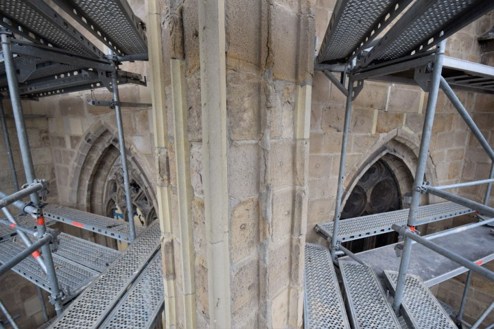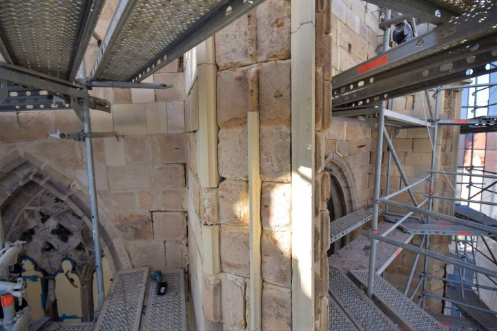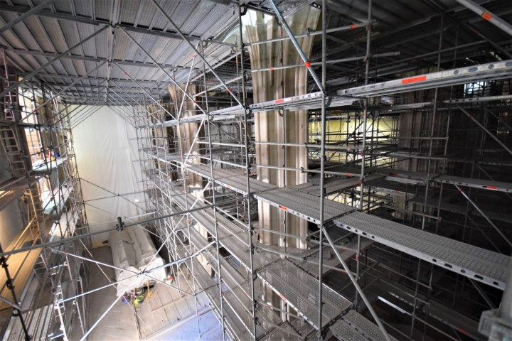 A következő ütemben a főszentély és a két mellékszentély belsejét, az északi fal egy részét és a tornyot állványozzák fel.