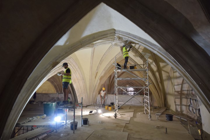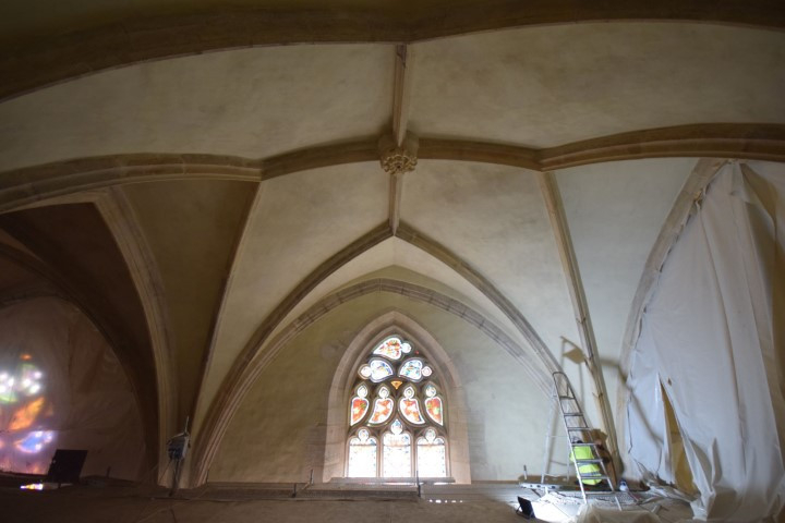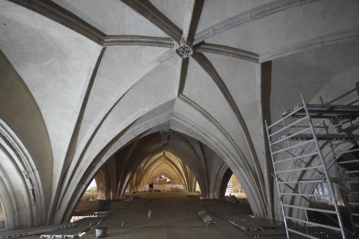 A templombelsőben jelenleg a hosszház keleti oldalát állványozták fel a boltozatig, ahol nemsokára befejeződnek a megerősítési és javítási munkálatok. Felkerült az új, kanálhátas vakolat is – a kissé hullámos felületű vakolattípust középkori templomok újravakolásánál használják azokon a falakon, amelyek eredetileg is vakolva voltak. Az új belső vajszínű festést kap. A templom külső részén a déli mellékszentély és a szentély falain dolgoznak, a köveket restaurálják, és a falakat statikailag megerősítik. A déli homlokzat állványzatából augusztusban két szeletet elbontottak, így két falszakasz mellett többek között a déli nagykapu is láthatóvá vált.