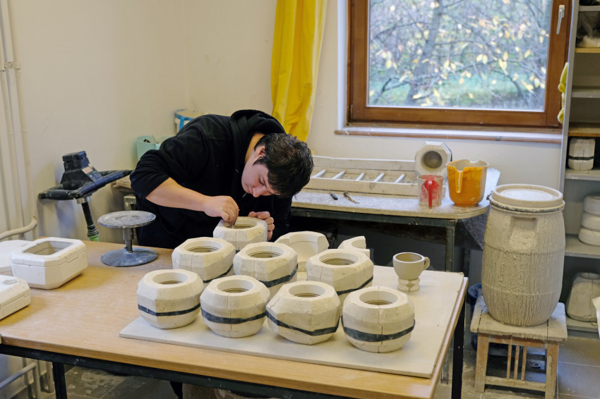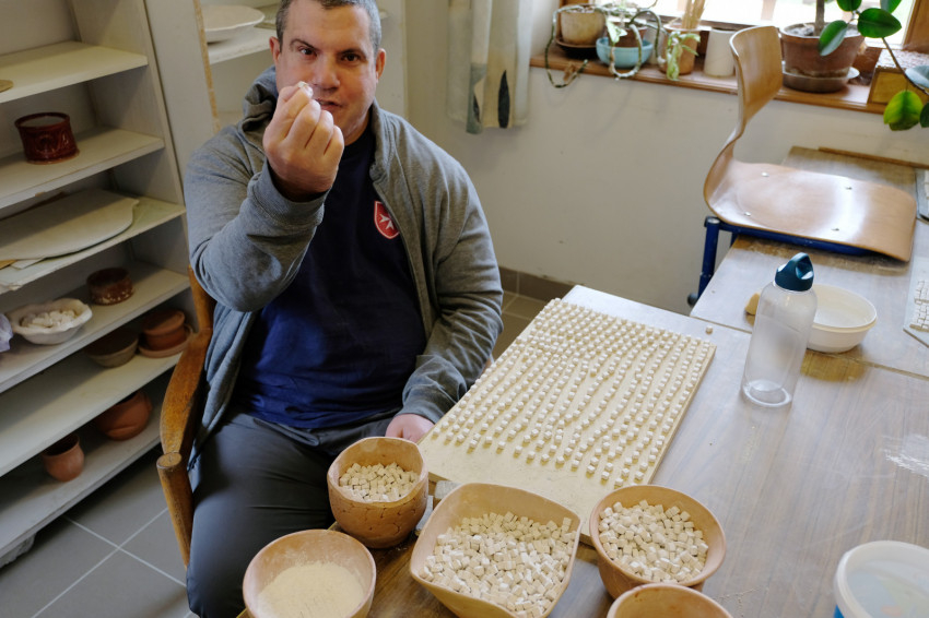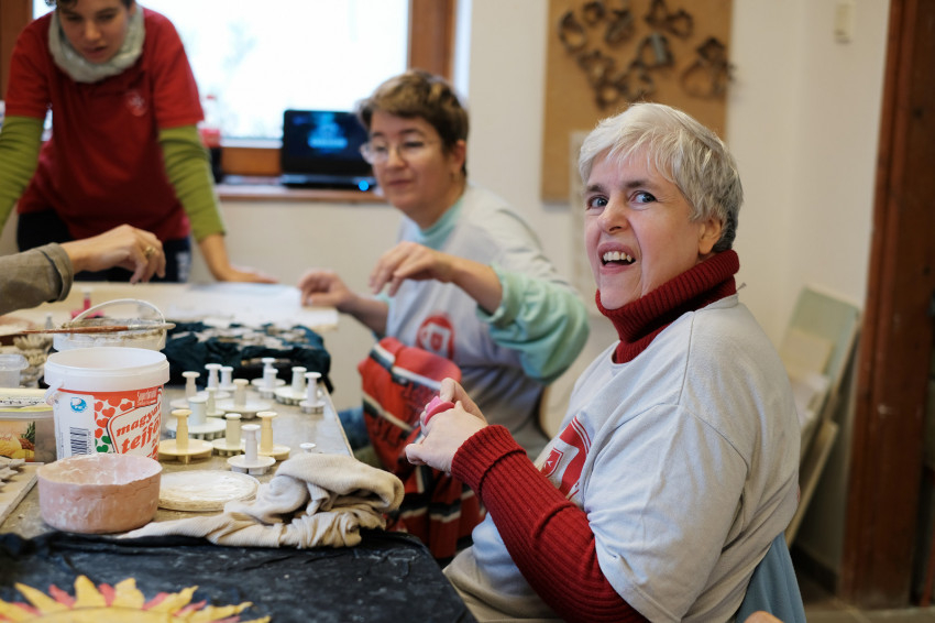 „Egyszerűbb technikákkal dolgozunk, mint például a lapítás, a szaggatás – olyan ez, mint amikor otthon mézeskalácsot készítünk. Könnyen elvégezhető művelet az öntés is, amivel szép, egyforma tárgyakat lehet létrehozni” – magyarázza a műhely vezetője, bár nekem ez sem tűnik egyszerűnek. A műhelyben mindenkinek megvan a maga feladata, így nagyon hatékonyan tudnak dolgozni a fogyatékossággal élők, és a részfeladatok eredményeként valami különleges és szép dolog születik, amit együtt hoztak létre. „A legtöbb munkahelyen, ahol megváltozott munkaképességű embereket foglalkoztatnak, általában borzasztóan monoton feladatokat kell végezni. Nagyon sokat jelent az itt dolgozóknak, hogy amit készítenek, az egyedi, kézműves termék. Látják a végeredményt, hallják, hogy eladtuk a kerámiákat egy-egy vásárban, és ez büszkeséggel tölti el őket” – mutat rá Júlia.
