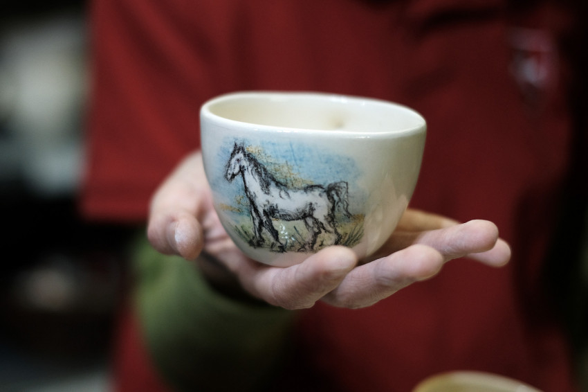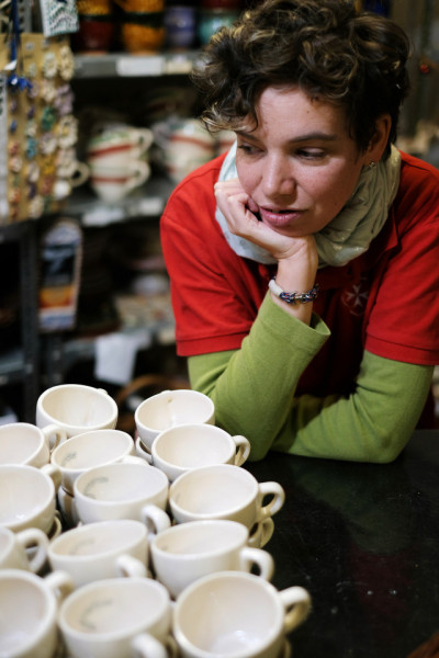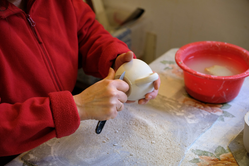 Egy másik szobában öntés zajlik, éppen bögréket készítenek. Beletöltik a formákba a masszát. Figyelni kell, hogy ne képződjön légbuborék, és ne legyen túl sok felesleges anyag a formák illesztésénél a tárgyakon. A még nyers darabok felületét aztán simítják, ezt már egy másik munkatárs végzi. Gondosnak kell lenni, hogy minden darab tökéletes legyen.