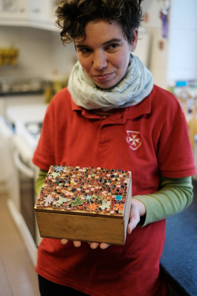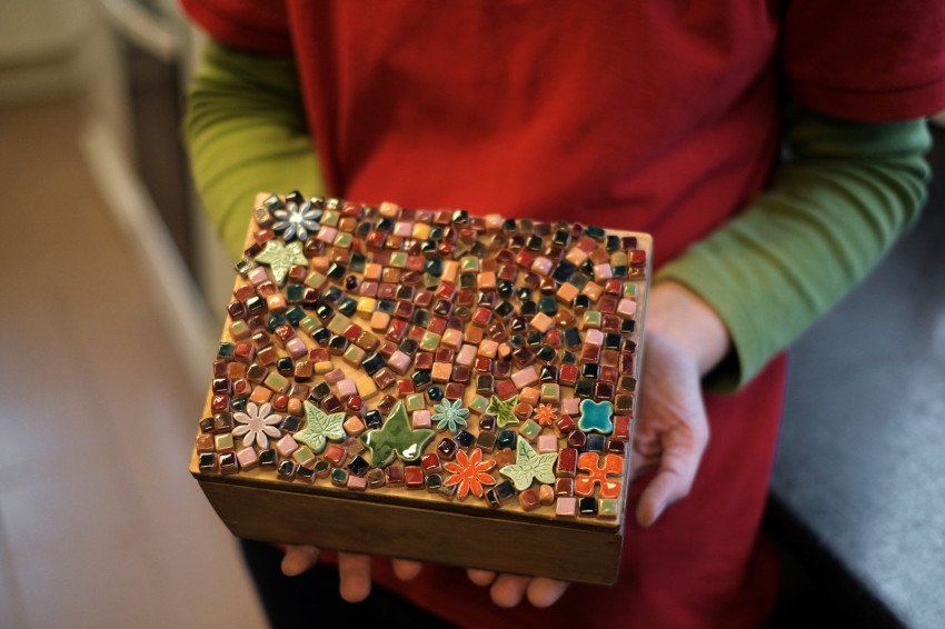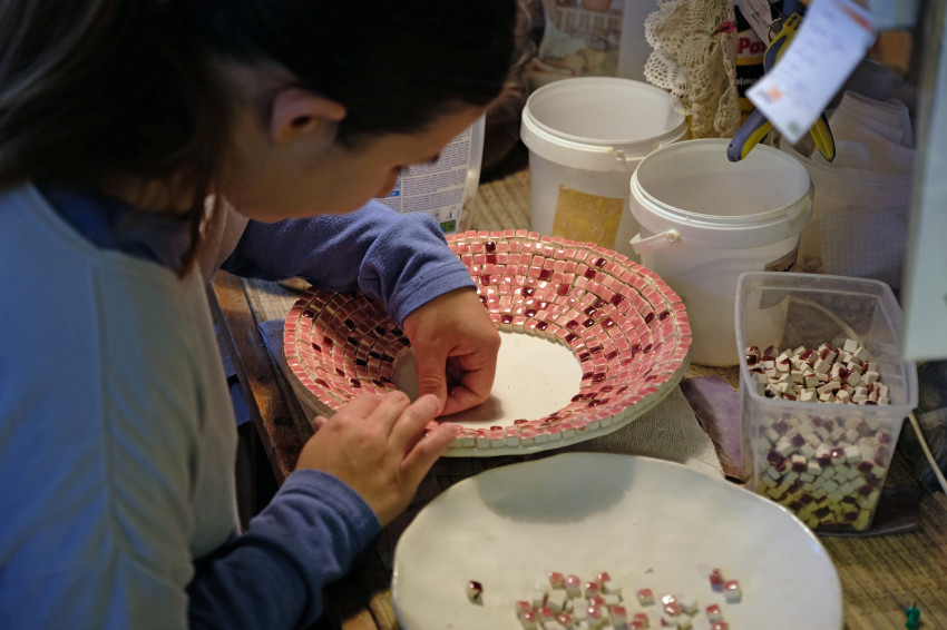 Az egyik nagyobb helyiségben mozaikokat készítenek. Kilapítják az agyagot, és apró kockákat vágnak belőle. Az egyik dolgozó lesimítja az éleket, amik néhány milliméteresek csupán. Egy másik kolléga a kockákat szép sorban berakólapra helyezi, amin kiégetik őket az alagsorban. A mázazók mázcseppeket csurgatnak rájuk, egyenként. Miután másodszor is kiégetik a kockákat, felhelyezik őket a tárgyakra, majd kifugázzák a mozaikot. Tálak, szenteltvíztartók, adventi mécsestartók készülnek így. Aprólékos munka ez, türelem és szeretet kell hozzá.