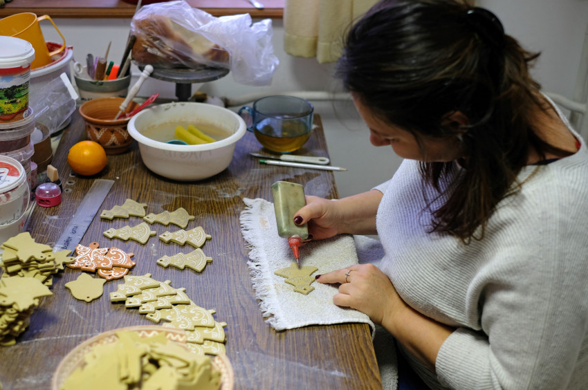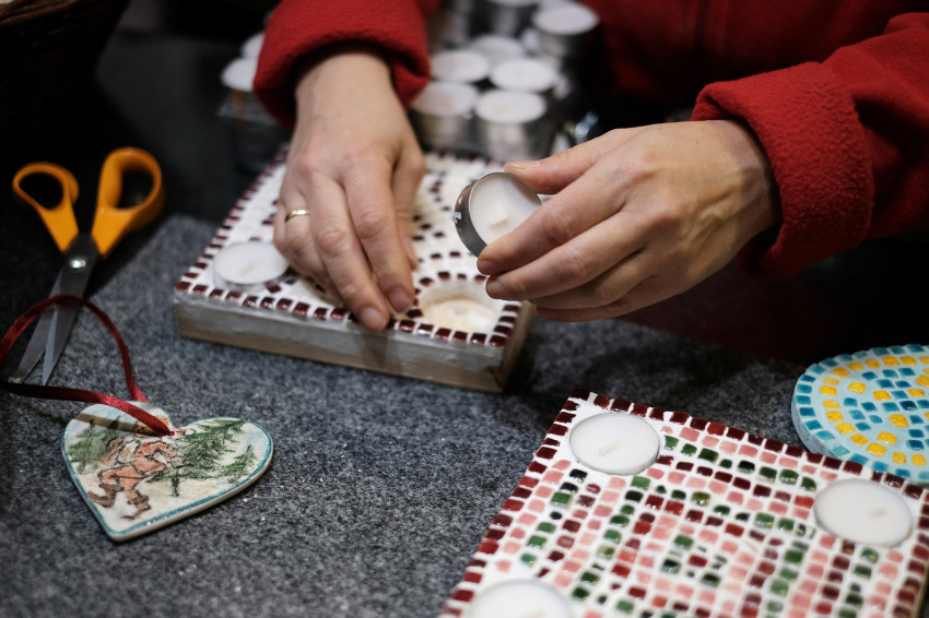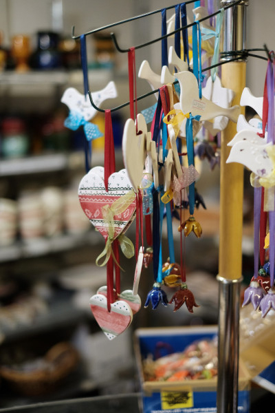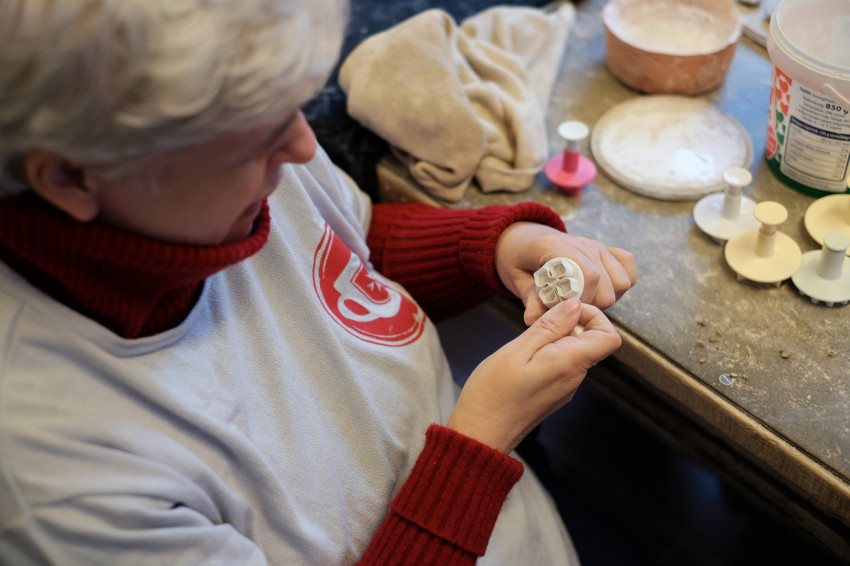 A következő szobában azt is megnézhetjük, hogyan díszítik a tárgyakat: éppen karácsonyi díszekre rajzolnak szép, kacsakaringós vonalakat írókával. A műhelyben a magas minőségre és a művészi kivitelezésre törekszenek, ezért a díszítést profik végzik: Júlia, egy segítő, illetve az egyik dolgozó, aki művész, és betegség miatt lett megváltozott munkaképességű. „Egy ilyen műhelyben a vezető döntésén múlik, hogy minden gyártási folyamatot fogyatékossággal élők végeznek-e – és akkor, bármilyen lesz is a végeredmény, elmondható, hogy a termékeket száz százalékban megváltozott munkaképességűek állították elő –, vagy pedig szakemberek is részt vesznek a gyártásban. Én ez utóbbi mellett döntöttem – mondja Júlia. – Az szeretném, hogy ne azért vegyék meg az emberek a kerámiákat, mert szociálisan érzékenyek, hanem azért, mert a termékeink tetszenek nekik. És amikor megtudják, hogy ezeket fogyatékossággal élők készítették, még nagyobb lesz az örömük.”