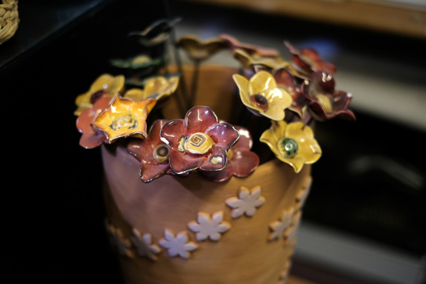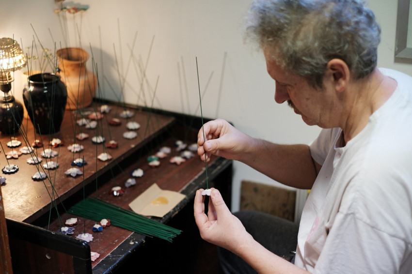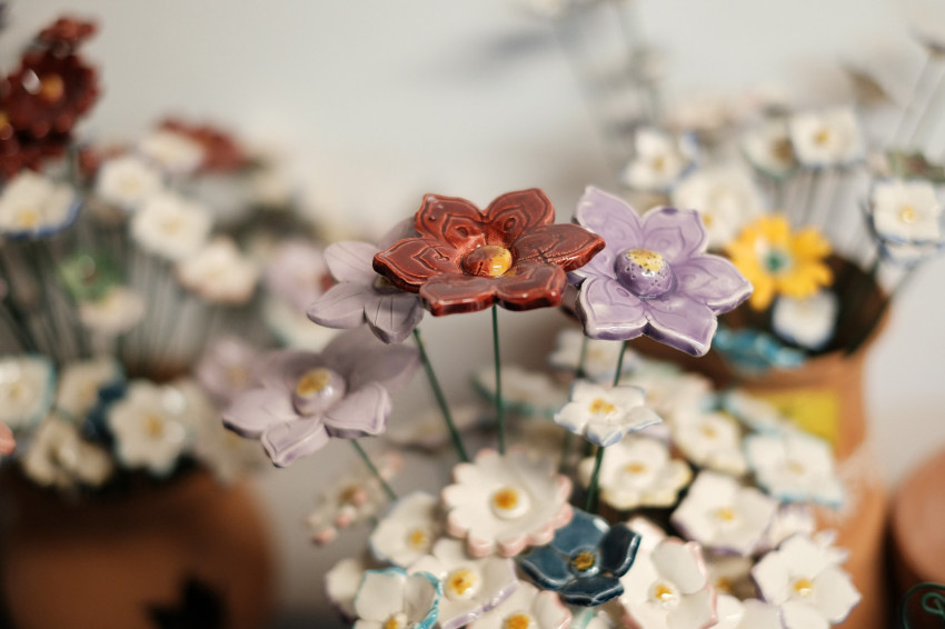 Egy nagyobb helyiségben többen is együtt dolgoznak. A műhely „sztártermékét”, a kerámiavirágokat készítik. Néhányan a kilapított agyagból kiszaggatják a virágok alapjait. Van, aki különböző méretű agyaggolyókat készít, ezekből lesznek a virágok közepei. Egy másik munkatárs kiszedi a szaggatókból a bennük ragadt agyagot, és ha sorjás valamelyik virág széle, lesimítja, amíg még puha az agyag. Az összeállítók megadják a kerámiák végső formáját, majd mázazzák és égetik a virágokat. Végül egy munkatárs felragasztja őket a drótból készült szárra. Minden részfeladatot gondosan kell elvégezni, hogy a késztermék szép legyen. Igazi csapatmunka ez.