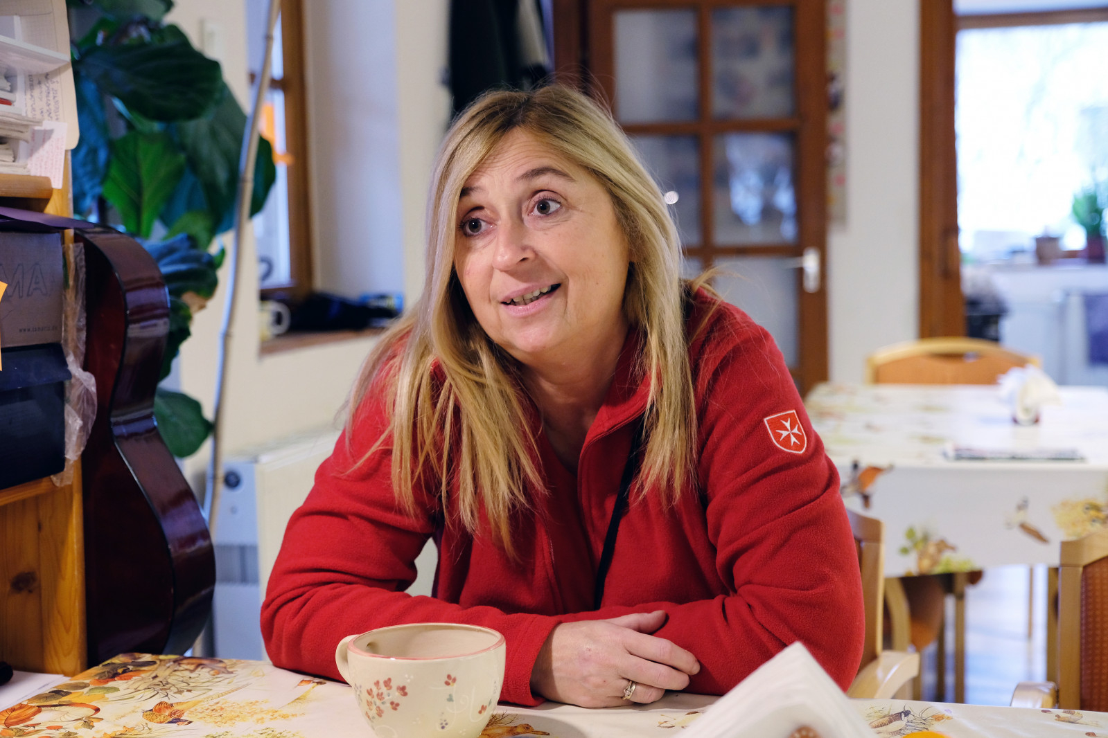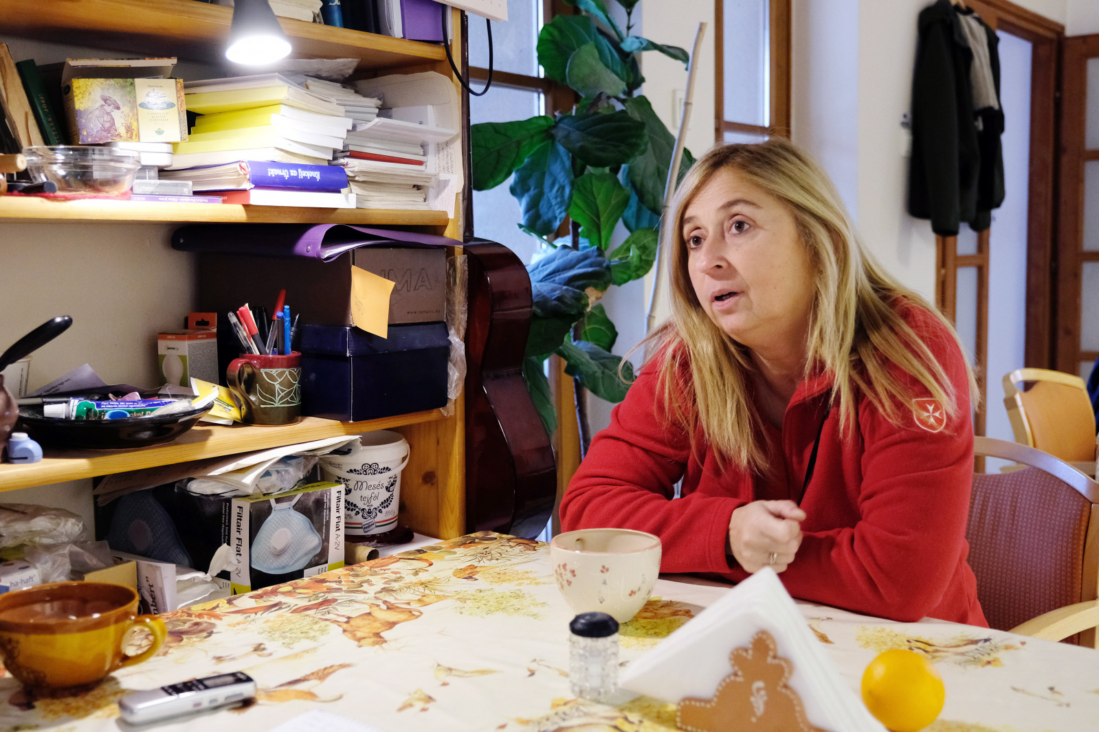Ahogy belépünk a műhelybe, az nem is munkahelynek tűnik, inkább családi otthonnak. Hangulata van: kész a tea a konyhában, a falon ott lóg Hagyó József atya képe, és egy gitár támaszkodik a szekrény oldalának. Mrázné Jáger Júlia és állandó munkatársa, Mazgon Krisztina vezet körbe minket a nem is kicsi műhelyben; tizenheten dolgoznak itt.