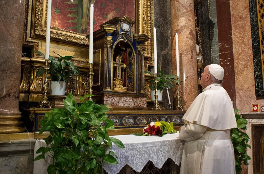 Ferenc pápa a Santa Maria Maggiore-bazilikából kilépve egy szakaszt gyalog tett meg a Via del Corsón, elzarándokolt a San Marcello al Corso-templomba, ahol az a csodatevő feszület található, amelyet 1522-ben hordoztak végig a város kerületein, hogy véget érjen a „nagy pestis” Rómában.
