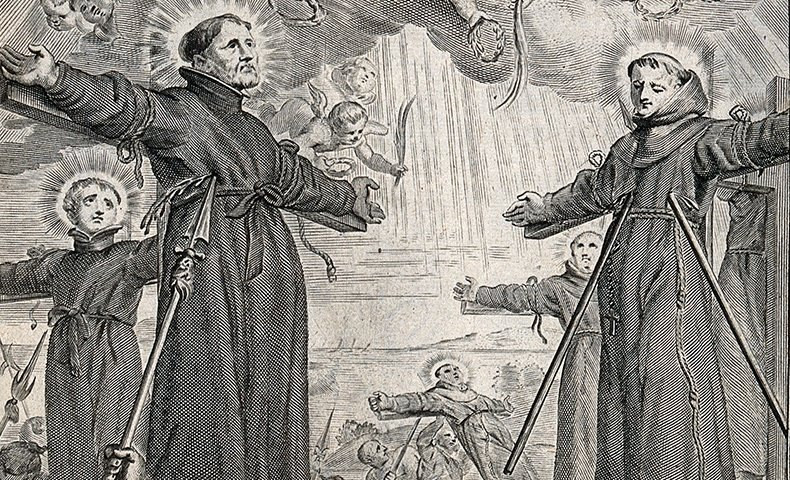 Japánban Xavéri Szent Ferenc kezdte el a missziót a 16. század első felében. A halálát követő évtizedekben már mintegy 250 ezer lelket számláló katolikus közösség élt az országban Nagaszaki központtal. Tojotomi Hidejosi hadúr és császári főminiszter, aki korábban elnéző volt a keresztényekkel szemben, a kudarcba fulladt koreai háború miatt ellenük fordult. A jezsuitákat kiutasította az országból, néhányan azonban maradtak, és folytatták a térítést. 1593-ban pedig ferencesek érkeztek Japánba a Fülöp-szigetekről, Manilából. A tilalom ellenére nyíltan hirdették az evangéliumot, sőt, két konventet és kórházakat is alapítottak. Hideyosi 1596 decemberében elfogatta a ferenceseket, s velük együtt három jezsuitát, valamint tizenöt japán hívőt, akik a ferences harmadrend tagjai voltak.