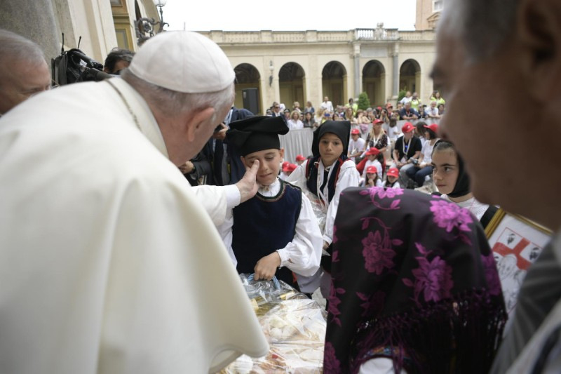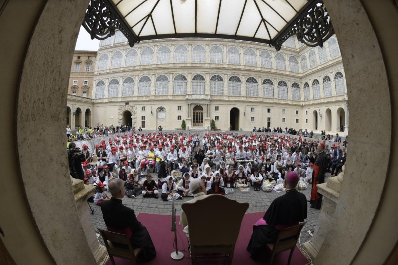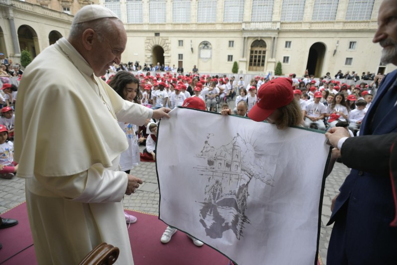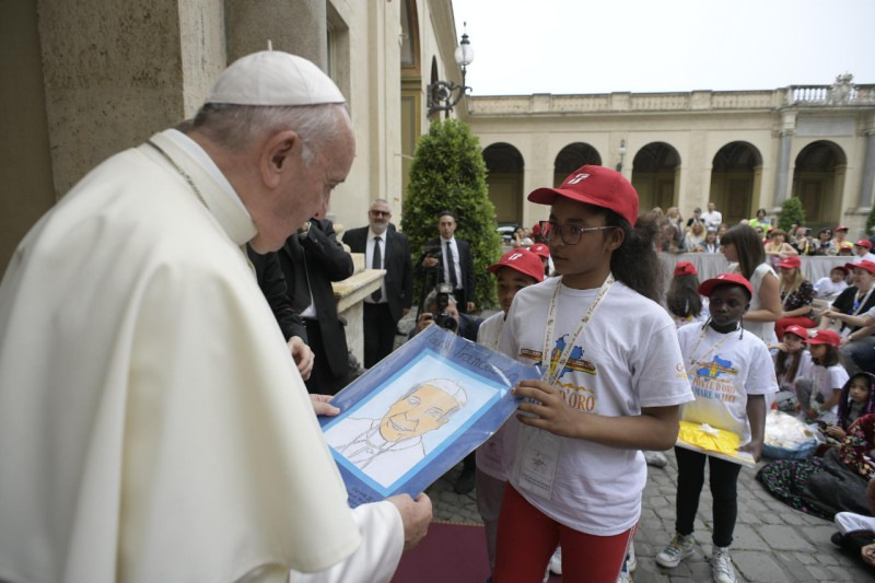 A gyerekek az Apostoli Palota Szent Damazusz udvarán találkoztak a pápával, akinek kérdéseket tehettek fel. Először egy genovai kislány kérdezett: Ferenc pápa annak idején milyen diák volt?