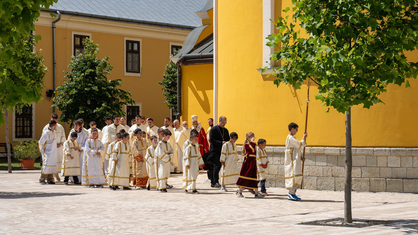 A délelőtti ráhangolódást követte a mennybemenetel ünnepkörében tartott Szent Liturgia, melyet Szocska Ábel nyíregyházi megyéspüspök jelenlétében celebrált Szabó Tamás pasztorális helynök, koncelebrált további tizennégy paptestvér, őket pedig húsz ministráns segítette a külső tábori oltár körül. A gyermekek hangsúlyos szerepe továbbá abban is megnyilvánult, hogy a kántori szolgálatba Gorcsa György főkántor mellett a Móricz-iskola diákjai kisebb kórusként kapcsolódtak be.