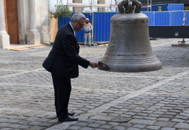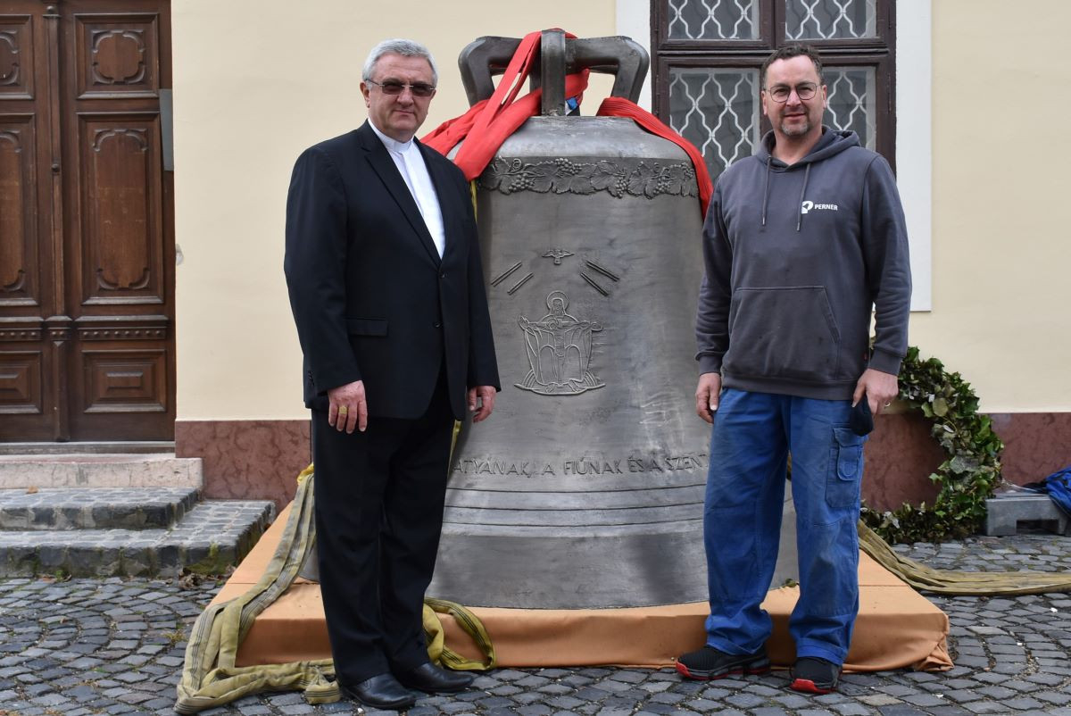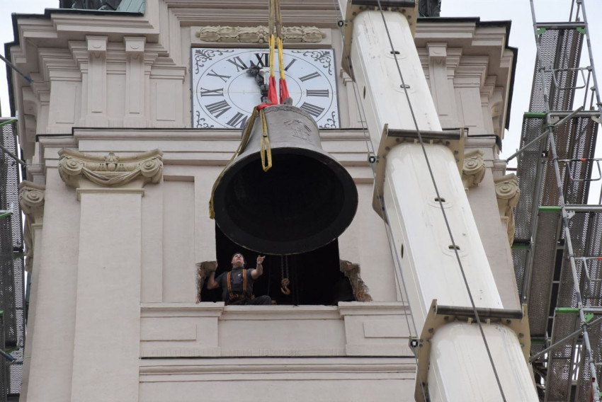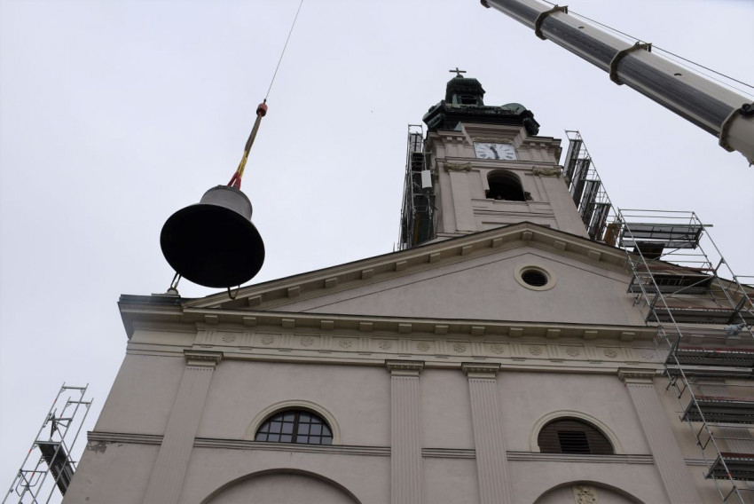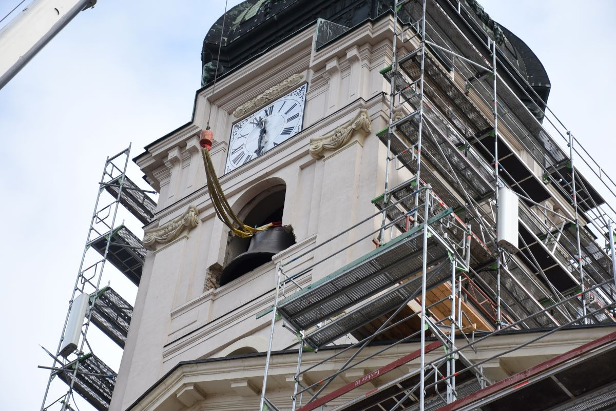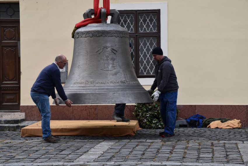 Szeptember 29-én szinte szélcsendben végezhette munkáját a darukezelő, amikor a több mint négy és fél tonna súlyú, Szentháromság tiszteletére szentelt harangot a magasba emelte. Mivel a harang átmérője 1970 milliméter, az ablak pedig 2000, ezért a biztonságos beemelés érdekében a falat meg kellett vésni.