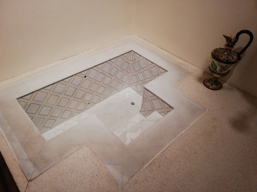 A kastély látogatása során azt is megtudhattuk, hogy a rekonstrukció során a fürdőszobában – betemetve – megtalálták a süllyesztett fürdőkádat, amit szépen kibontottak, helyreállítottak. A megmaradt néhány eredeti csempét kiegészítették. A helyiségben egy szép virágos mintákkal díszített vécékagylót is láthatunk, Hungária felirattal. A vízellátáshoz szükséges nyomást a toronyban elhelyezett, gőzgép pumpálta tartály és a csövekben lévő vízoszlop biztosította. A fürdőben a vízvezetékrendszerből alig látszódott valami: egy „leppentyű” elmozdításával a fali ólomcsöves vezetékből a szennyvíz a pincébe jutott, onnan pedig az északi oldalon lévő derítőbe került – így működött a grófnői fürdőszoba.