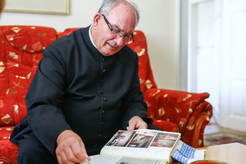 Az öt kis bakonyi faluban szinte észrevétlenül telt el 42 év. „A hívek ragaszkodnak hozzám, azt mondták, nem engednek el. Én sem bírnék már máshova menni. Pedig 1978-ban ideiglenesen kerültem ide. Az itteni pap váratlanul külföldre ment, gyorsan kellett egy mozdítható ember, és engem küldtek Várpalotáról. Nem könnyen jöttem, mert a nyolc év alatt nagy fejlődést értünk el a kórussal az előző szolgálati helyemen, de Szentlászlón úgy fogadtak, mintha hazajöttem volna. Több győri bencés osztálytársam is innen származott, a szüleik nagy szeretettel vettek körül. Hamar megszerettem ezt a falut. Amikor helyezni akartak, mindig éppen egy nagyobb munka kellős közepén voltam, így azt kértem, várjanak, amíg befejezem.”