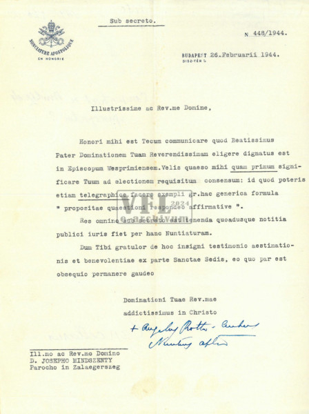 Szokás volt, hogy a választott püspökök neveinek nyilvánosságra hozatala előtt a kinevezéshez előzetesen kikérjék a jelöltek beleegyezését. A Szentszék magyarországi képviselője, Angelo Rotta nuncius a belegyezésre vonatkozó kérdést 1944. február 26-án tette fel írásban Mindszenty József zalaegerszegi plébánosnak – a latin nyelvű irat keletkezésének nyolcvanadik évfordulója alkalmából mutatja most be az Érsekségi ékességek sorozat a dokumentum digitális másolatát.