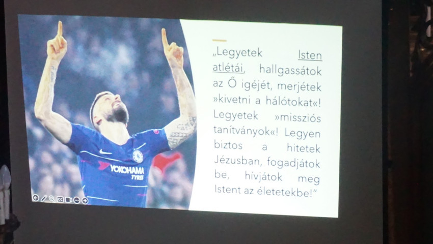 Az egyik legnépszerűbb sportból, a fociból kiindulva fogalmazta meg üzeneteit a fiataloknak, majd előadásának vége felé ő is visszatért a fiatalon elhunyt Boldog Carlo Acutis nagyszerű életpéldájához.