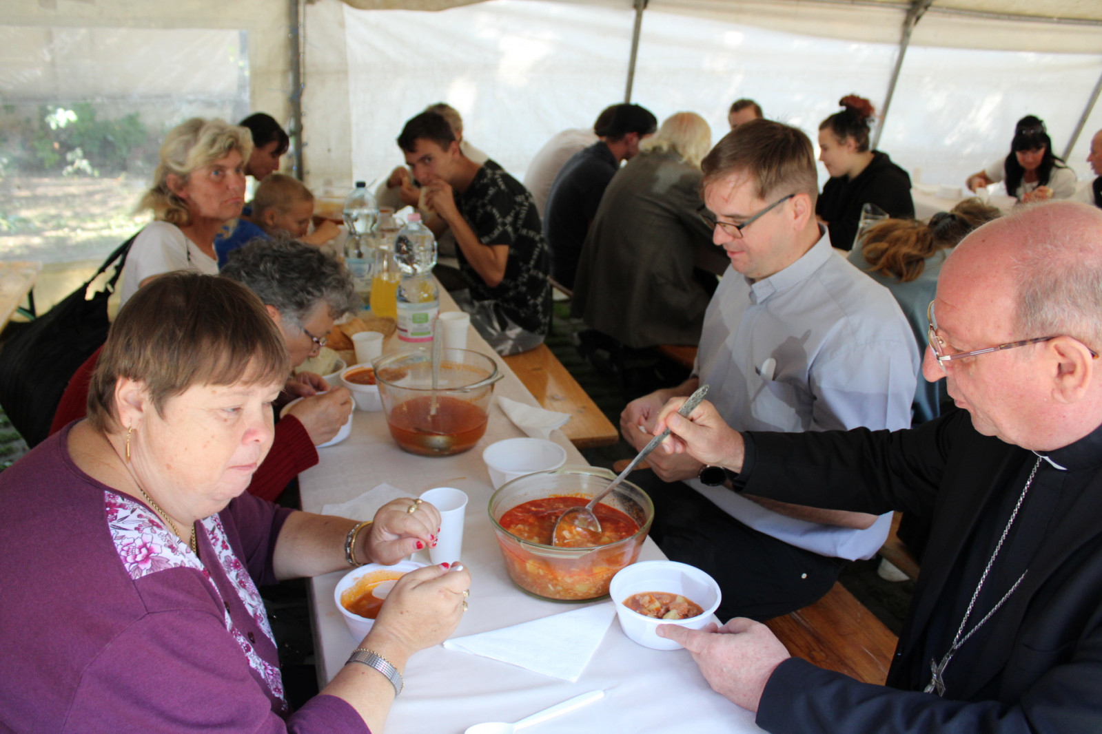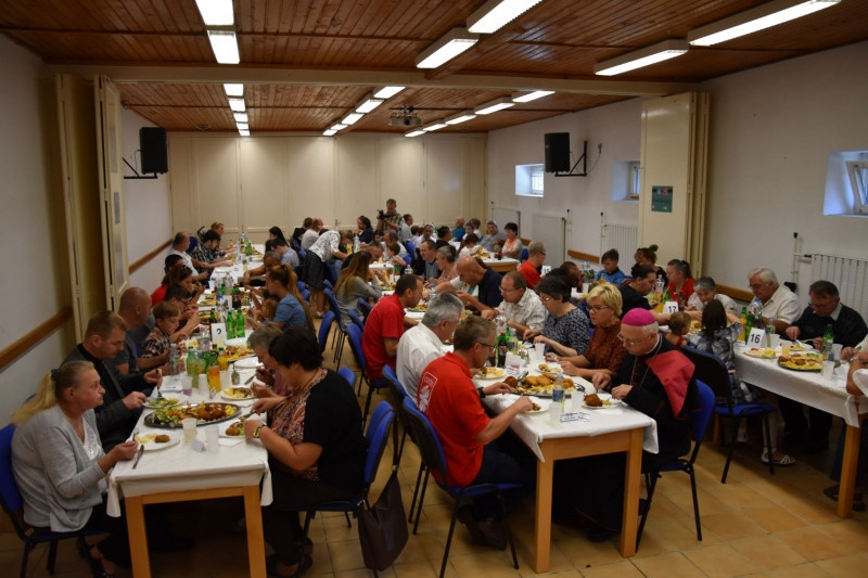 Az étkezést megelőzően Felföldi László püspök is köszöntötte a jelenlevőket, kiemelve: „A szeretetvendégség az élet ünnepe. Szeretettel és hálával fordulunk egymáshoz vendéglátók és vendégek”. A pécsi megyéspüspök vezette az étkezés előtti imát, majd az önkéntesekkel együtt részt vett az étel felszolgálásában; baráti közvetlenséggel üdvözölt minden asztaltársaságot, akik közül több meghívottat látásból már ismert.