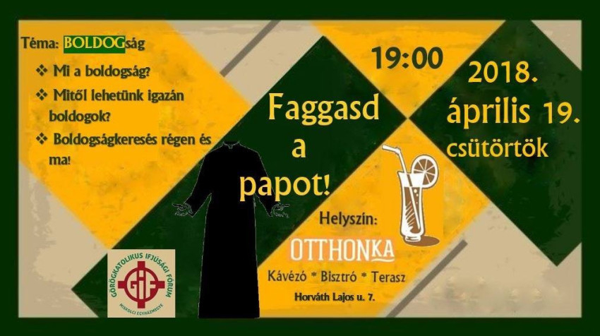 „A lelkes, kérdezni vágyó fiatalokat az Otthonka nevű kávézóban vártuk, ahol több mint harmincan gyűltünk össze. Terveink szerint minden alkalommal, havonta egyszer ezen a helyszínen találkoznánk. Az Otthonka, ahogy a neve is mondja, egy otthonos, barátságos kávézó, bisztró, mely tökéletes helyszínnek bizonyult, és reményeink szerint az is marad a Faggasd a papot! című program számára. A helyszín nem változik, viszont a téma igen, minden alkalommal más-más témát hozunk fel, melynek kapcsán papjaink kíváncsian várják a kérdéseket vagy hozzászólásokat.