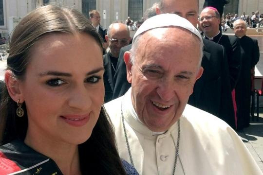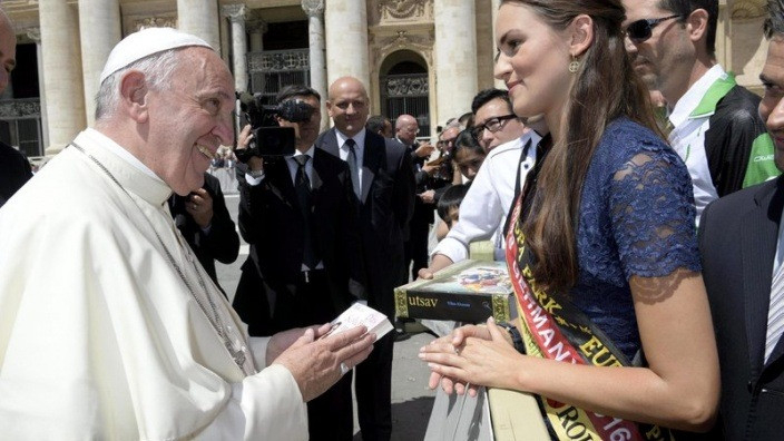 A Szentatya kezébe vette a könyvet, halkan megismételte a címét – mondta a szépségkirálynő, aki még arra is megkérte Ferenc pápát, hadd készítsen egy szelfit találkozásukról.
