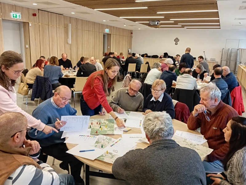 Hulitka Róbert berceli plébános ismertette azt az online térképet, amelyen könnyen áttekinthető az általa ellátott tizenegy település jelenlegi helyzete, az egyházközségek életereje, a hívők aktivitása. A résztvevők ezután csoportokra bontva elkészítették saját térképüket, majd közösen megbeszélték, hol tapasztalható hiány az emberi erőforrás tekintetében, hol vannak olyanok, akiknek csak egy kis bátorításra, támogatásra lenne szükségük, és számba vették, ismernek-e szerteágazó kapcsolati hálóval rendelkező híveket.