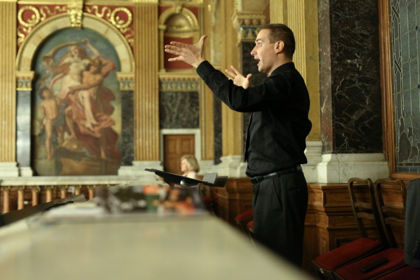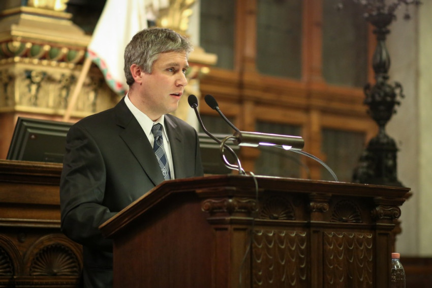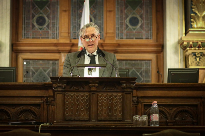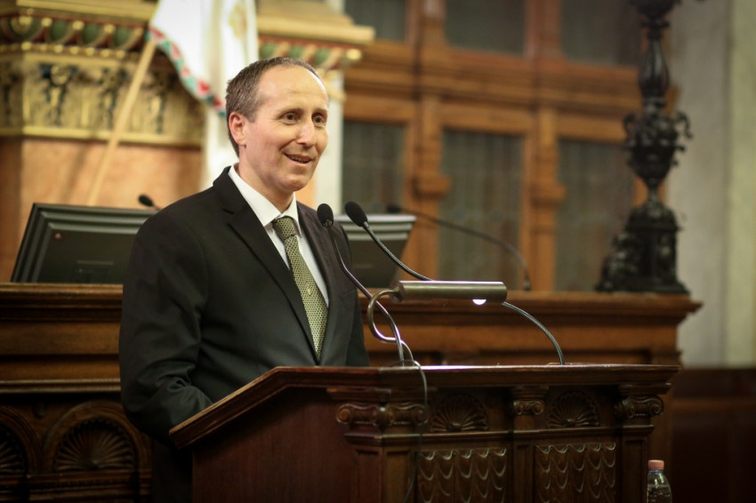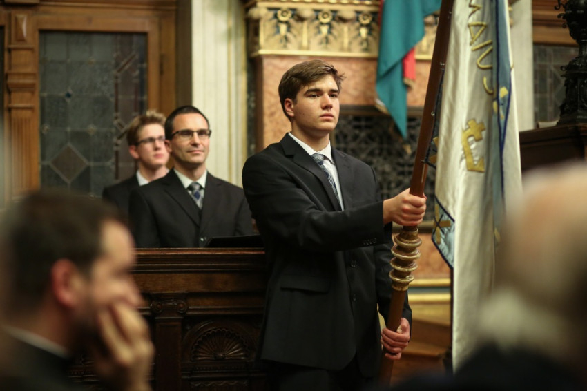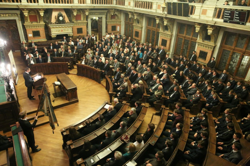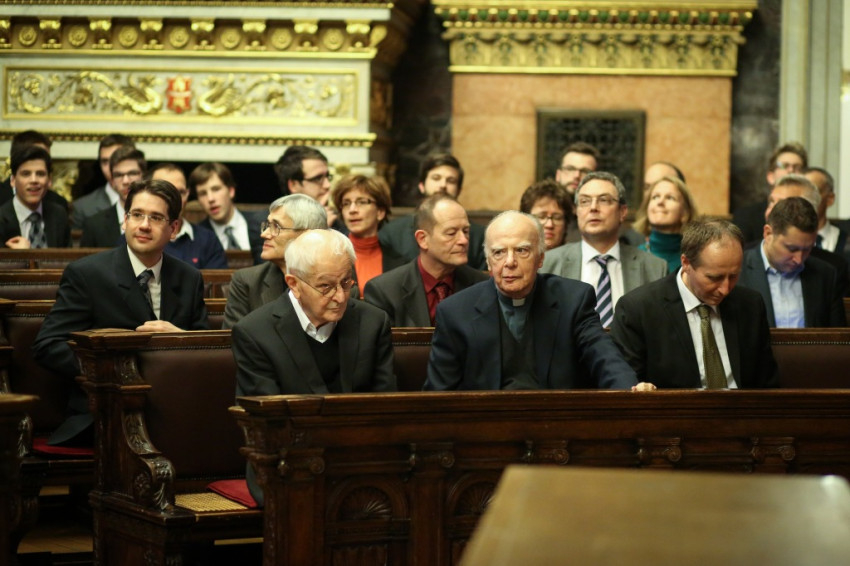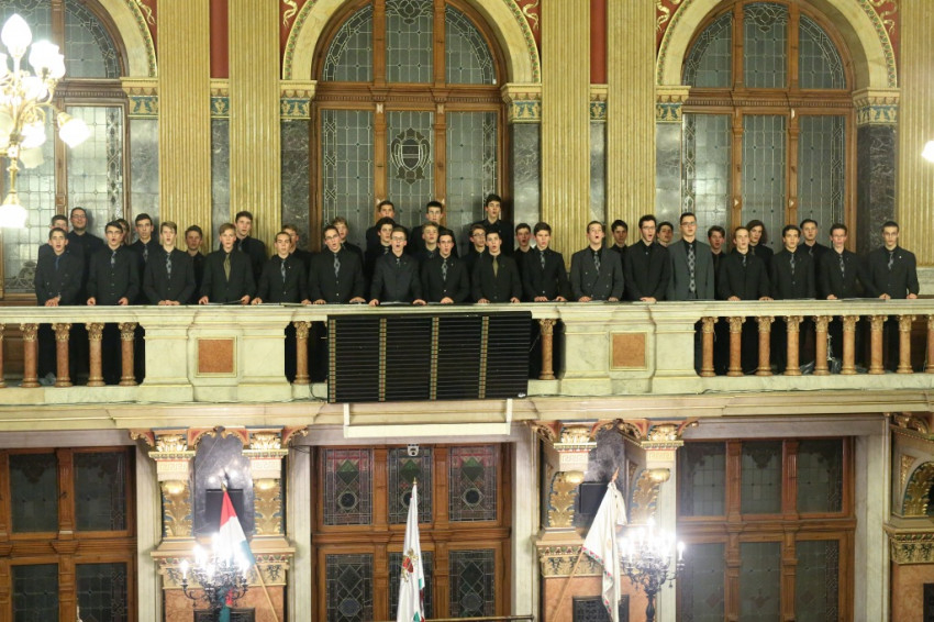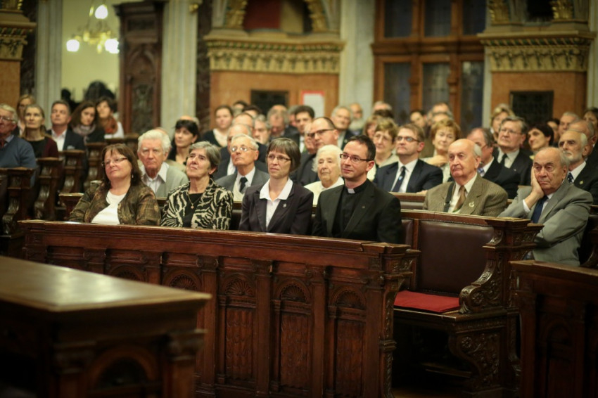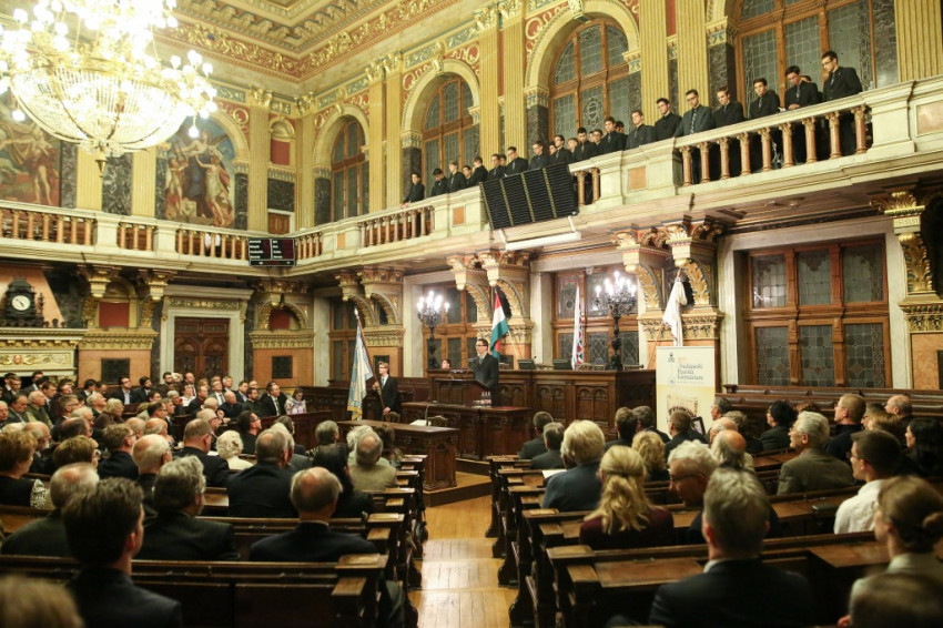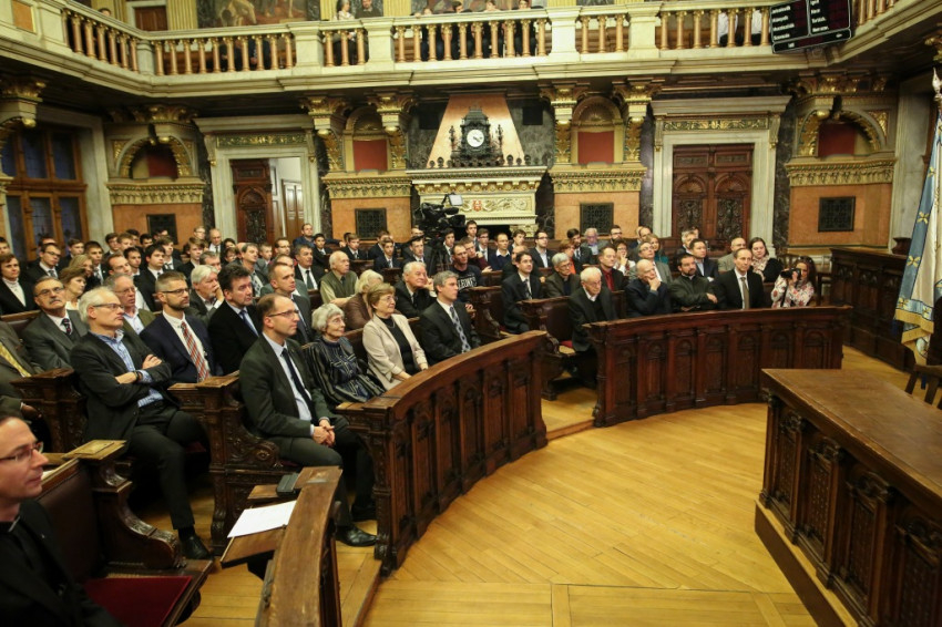 A Steindl Imre tervezte, 1870 és 1875 között épült Új városháza közgyűlési termében, a főváros egyik legreprezentatívabb, Lotz-freskókkal díszített termében gyűltek össze a piarista jubileumot ünneplők. A piarista nagycsalád – mai és korábbi tanárok, szerzetesek, jelenlegi és öregdiákok, szülők – mellett sokan elfogadták a rend meghívását, hogy visszatekintsenek a pesti gimnázium 1717-es kezdeteire.