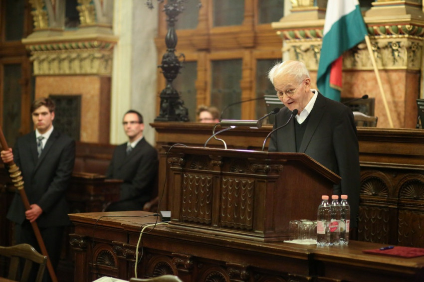 Mi az iskola szerepe az ember életében? – ebből a kérdésből kiindulva Jelenits István, a gimnázium nyugalmazott szerzetestanára, korábbi piarista tartományfőnök Kalazanci Szent József jövőbe látó felismerését méltatta: a rendalapító azt értette meg, hogy a modern világban mindenkinek tanulnia kell, aki élni akar. Korában a gazdagok privilégiuma volt a tanulás, Kalazanci József pedig megnyitotta iskoláit a szegények gyerekei előtt. Ahogy az egyéni boldogulás alapja a tanulás, úgy az ország fejlődését is a „szellemi segédmunkások” tudják előmozdítani. Ezt tették a piaristák Pesten: hozzá tudtak járulni ahhoz, hogy a török uralom alatt szinte megsemmisült város ismét európai rangra emelkedhessen. Mikor megkezdték működésüket, négy piarista szerzetes szerény körülmények között már az első évben mintegy 150 szegény gyereket tanított, majd felépítették és fenntartották 100 éven át Pest egyetlen középiskoláját. „Műveltséget hoztak Pestnek, elterjesztették a természettudományos képzést, kultúrát teremtettek.”