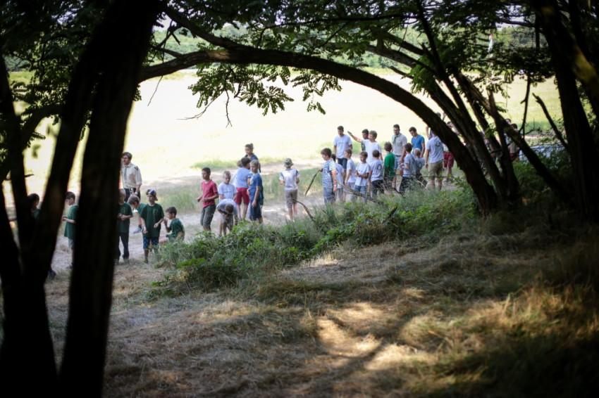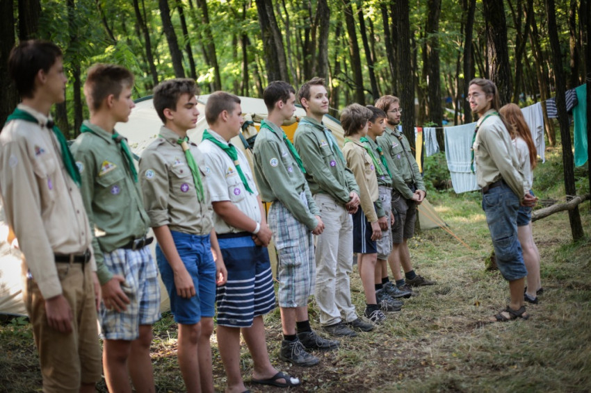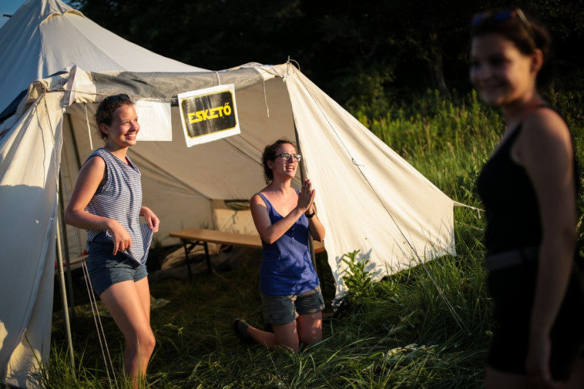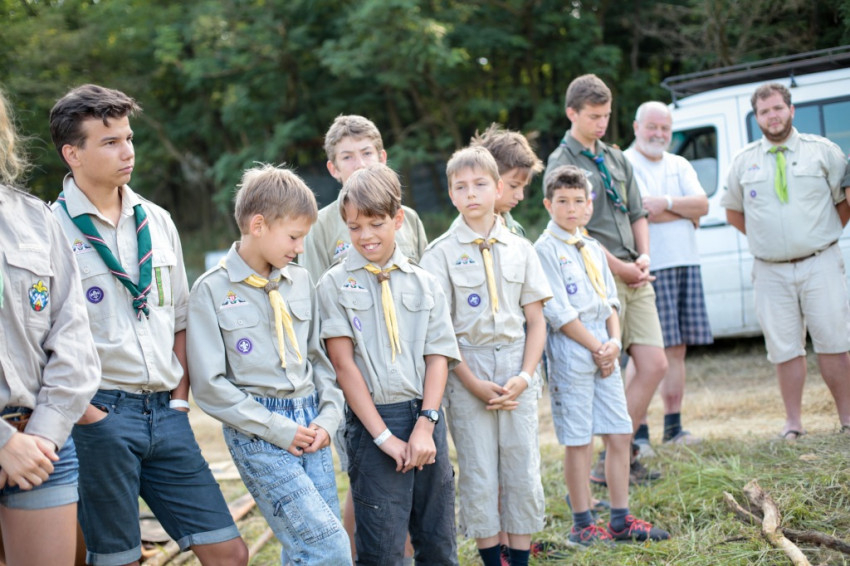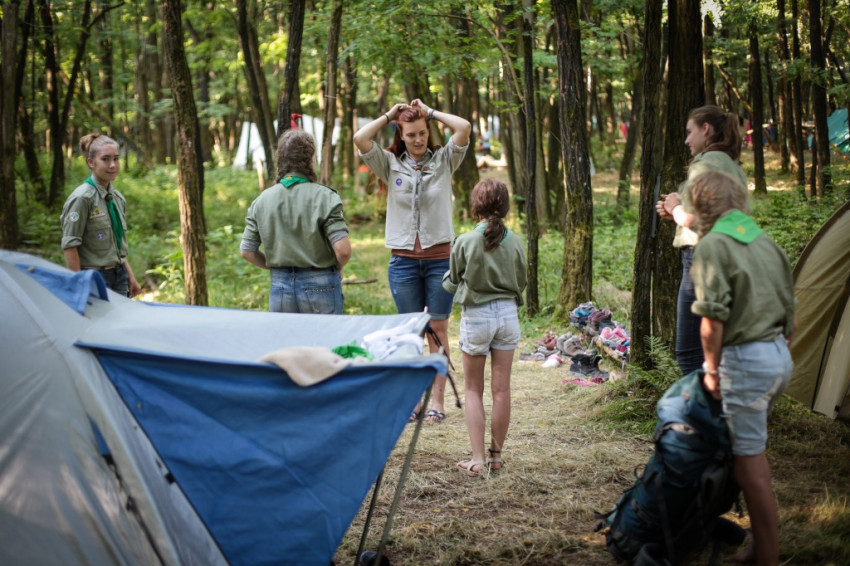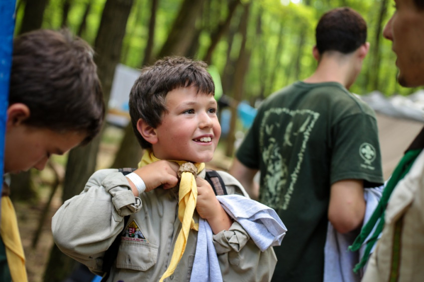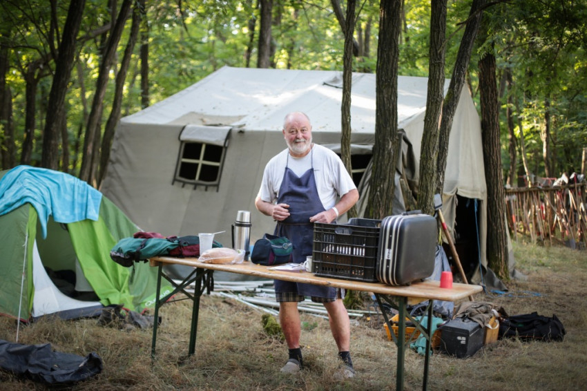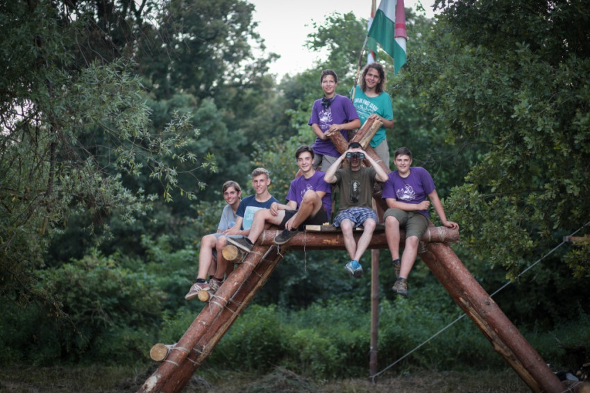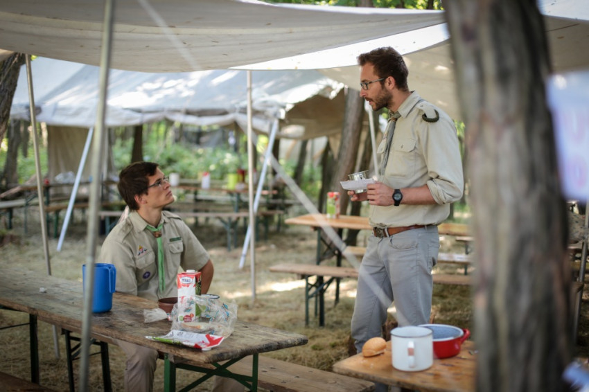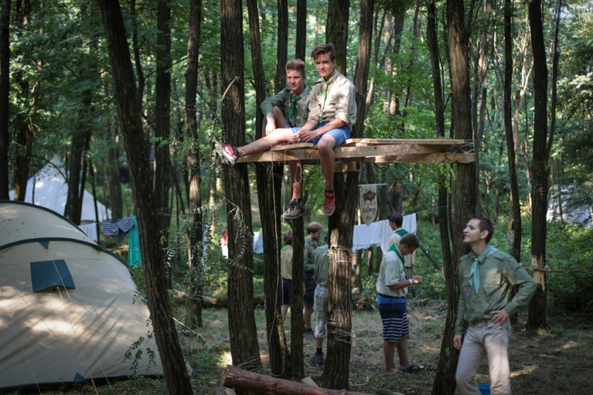 A hatos altáborba igyekszünk, ahova baráti szálak kötnek. A budakalászi Szent István Cserkészcsapat és a békásmegyeri Szent József Cserkészcsapat a vendéglátónk. Miután felverjük a sátrunkat, Wettstein András, a budakalászi csapat alapítója, Lontai Levente táborparancsnok a békásiak részéről pedig Boros Gábor vezet körbe a táborban. A bozóttól megtisztított ösvényeken ismerkedünk a cserkészek világával. Kijövünk a természetbe és mindent nekünk kell létrehoznunk, hogy életkereteinket megteremtsük. Az erdő nemcsak a vaddisznóknak meg a szarvasoknak ad otthont, mi is képesek vagyunk benne létezni – mondja Lontai Levente, akit már gyerekként ez fogott meg a cserkészetben.