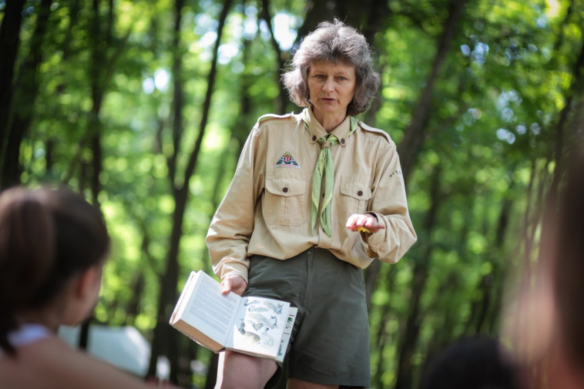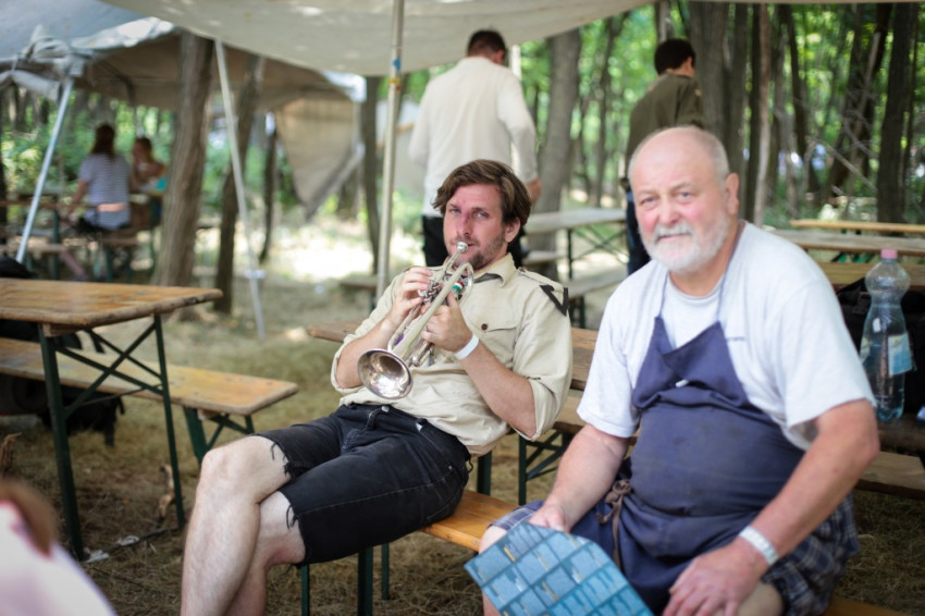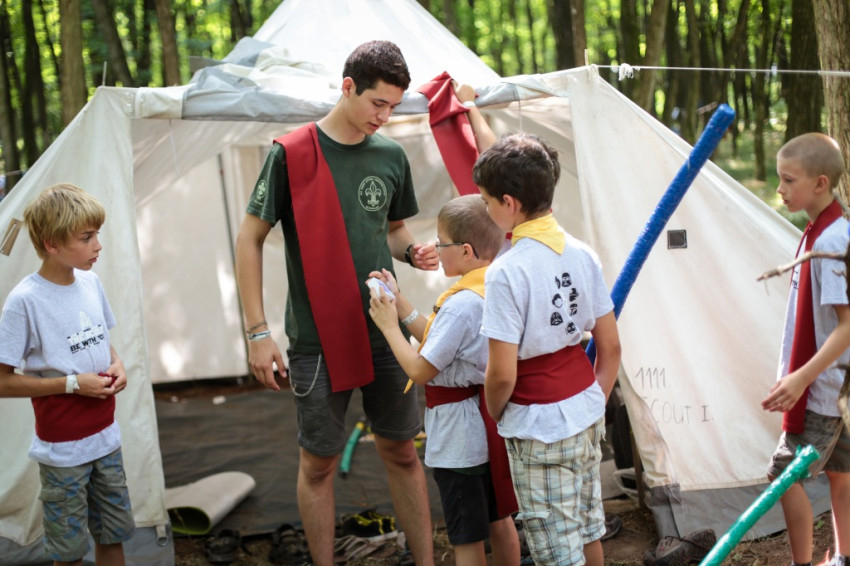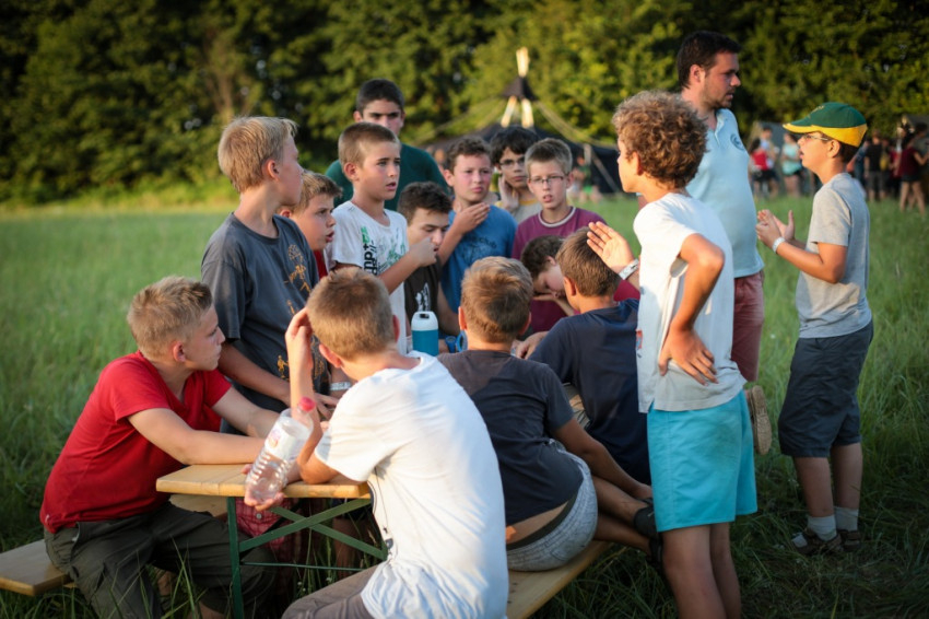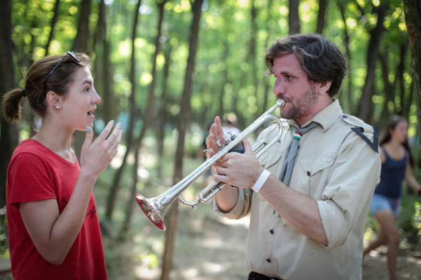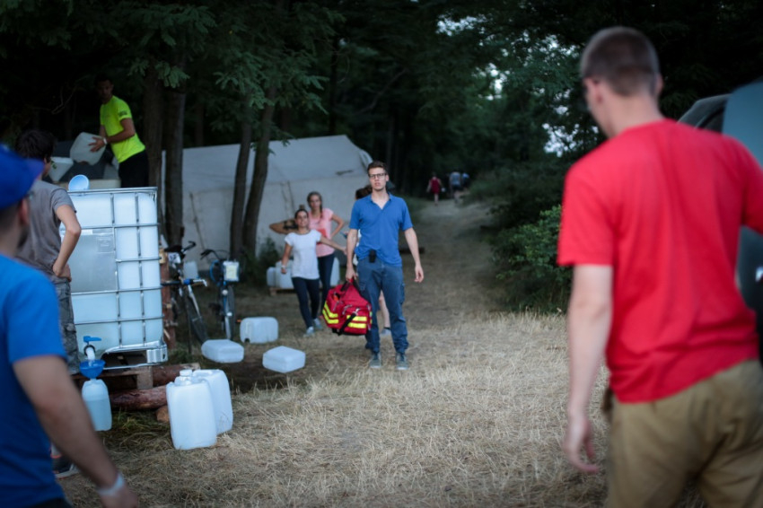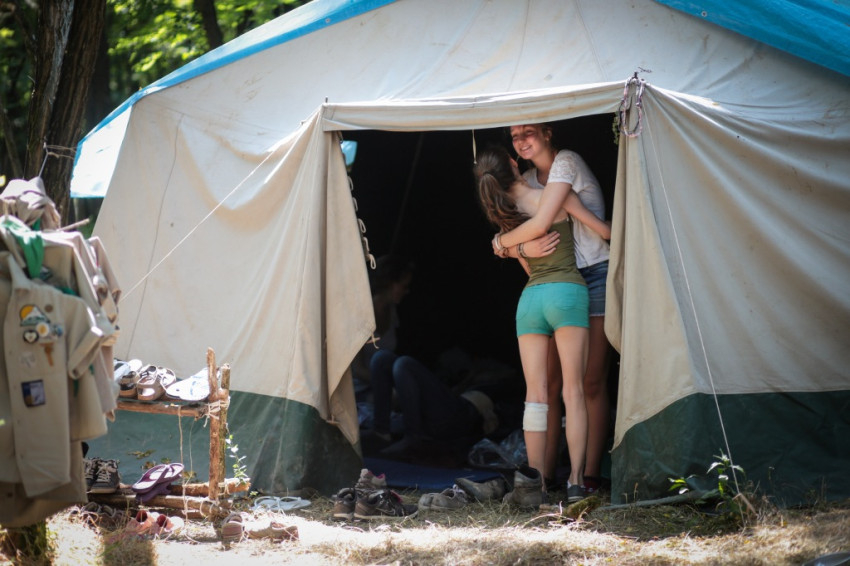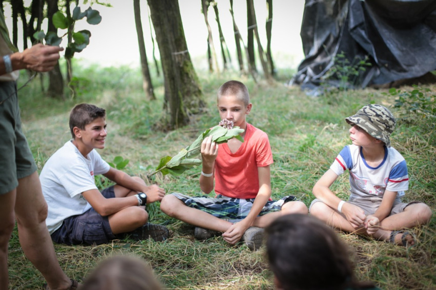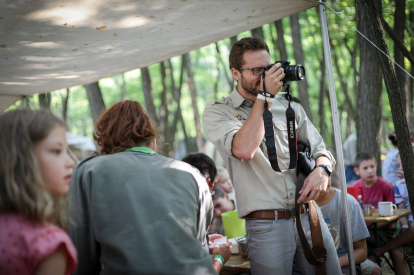 A hatos altáborba igyekszünk, ahova baráti szálak kötnek. A budakalászi Szent István Cserkészcsapat és a békásmegyeri Szent József Cserkészcsapat a vendéglátónk. Miután felverjük a sátrunkat, Wettstein András, a budakalászi csapat alapítója, Lontai Levente táborparancsnok a békásiak részéről pedig Boros Gábor vezet körbe a táborban. A bozóttól megtisztított ösvényeken ismerkedünk a cserkészek világával. Kijövünk a természetbe és mindent nekünk kell létrehoznunk, hogy életkereteinket megteremtsük. Az erdő nemcsak a vaddisznóknak meg a szarvasoknak ad otthont, mi is képesek vagyunk benne létezni – mondja Lontai Levente, akit már gyerekként ez fogott meg a cserkészetben.