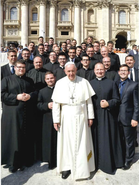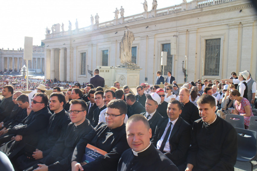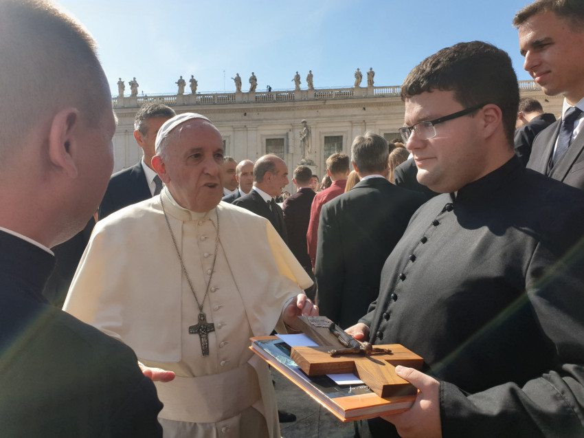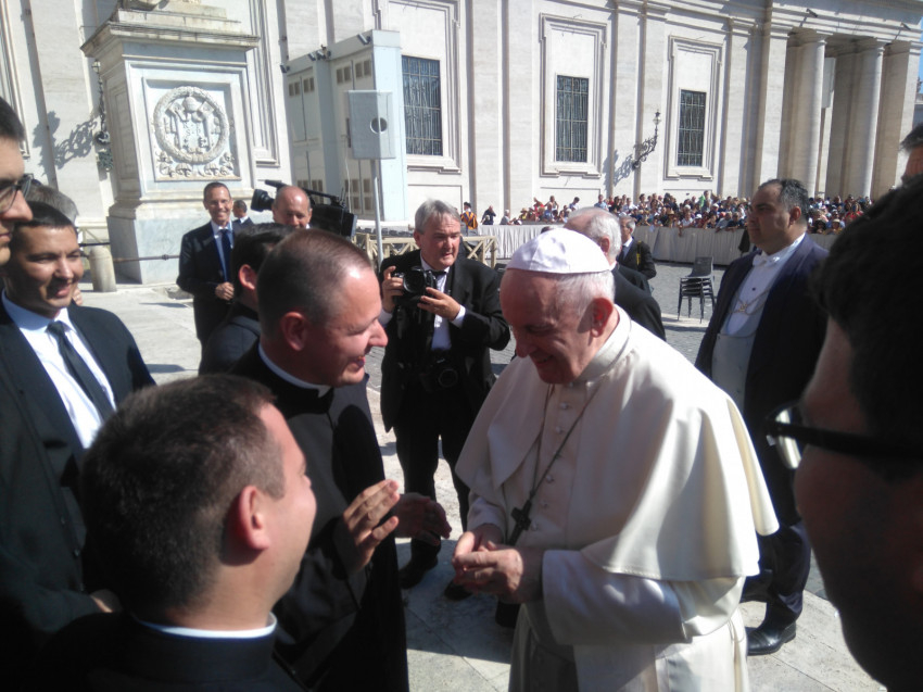 A legnagyobb élmény természetesen a Szentatyával való találkozás volt. A kitűnő szervezésnek köszönhetően a szokásos szerdai audienciát Ferenc pápától néhány méterre hallgathattuk, majd arra is alkalmunk nyílt, hogy csoportképet készítsünk vele. Megérintett minket a pápa mosolya és személyessége, hisz eddig ezt csak a képernyőről láthattuk. Megrendítő volt, ahogy lehajolt a betegekhez, és mindegyikükhöz volt néhány személyes szava; ugyanígy tett valamennyi hozzá járuló zarándokkal is. Meglepetésünkre találkozásunk egy csoportképnél jóval többet tartogatott. Miután megtudta, hogy magyarok vagyunk, anyanyelvünkön köszöntött minket: „Isten hozott!” A szeminárium ajándékának átadása után megáldott bennünket, és lelkünkre kötötte, hogy ne feledkezzünk meg Máriáról, és imádkozzuk a rózsafüzért. Kaptunk is ajándékba tőle egy-egy szentolvasót. Bár a találkozás nem volt több néhány percnél, és az egész délelőttöt ünneplőben töltöttük a tűző napon, mégis teljesen feldobódtunk tőle, és sokszor visszaemlékezünk majd ezekre a pillanatokra.
