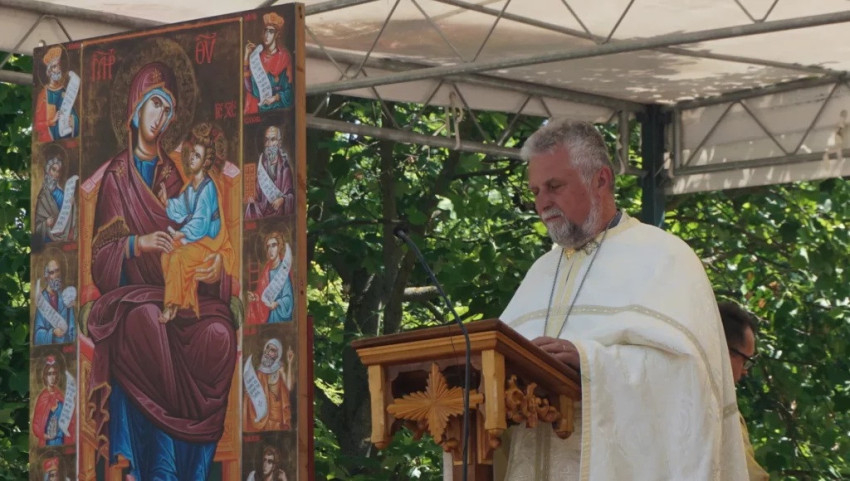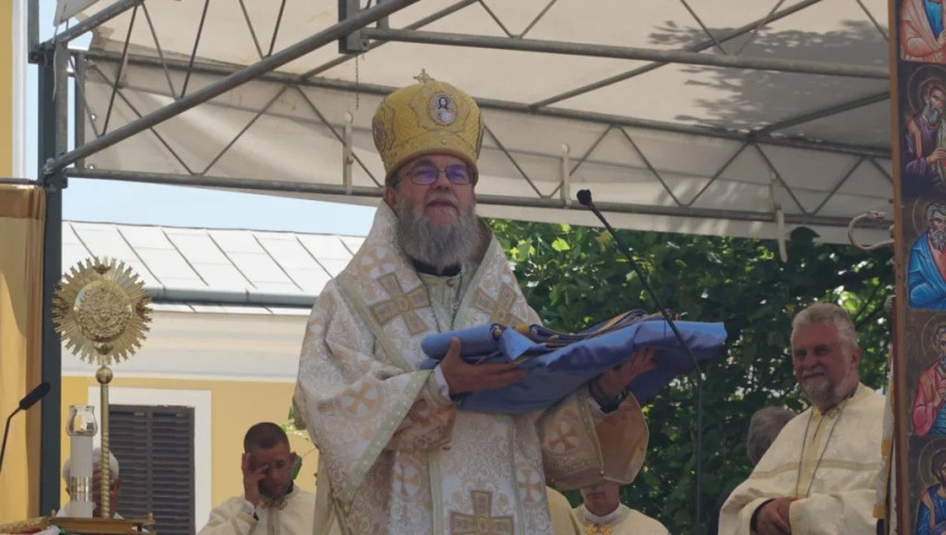 Orosz Atanáz püspök a liturgia záróáldása után meghintette a híveket szenteltvízzel, és megáldotta a kegytárgyakat.