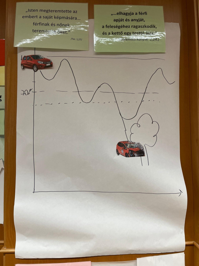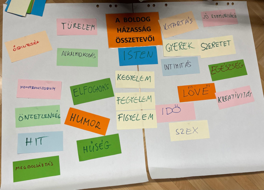 Szóba kerültek a különféle életszakaszok és a szükségszerűen bekövetkező krízishelyzetek kezelésének kérdései is, amelyek bemutatásához és a jegyespárokkal történő átbeszéléséhez számos hasznos és kreatív módszertani eszközt mutatott be a Hortobágyi házaspár: feladatlapokat, mindenki által elkészíthető fogalomkereső kártyákat, jól szemléltethető „boldogság – válság”-diagramot a szerelem három dimenziójáról.