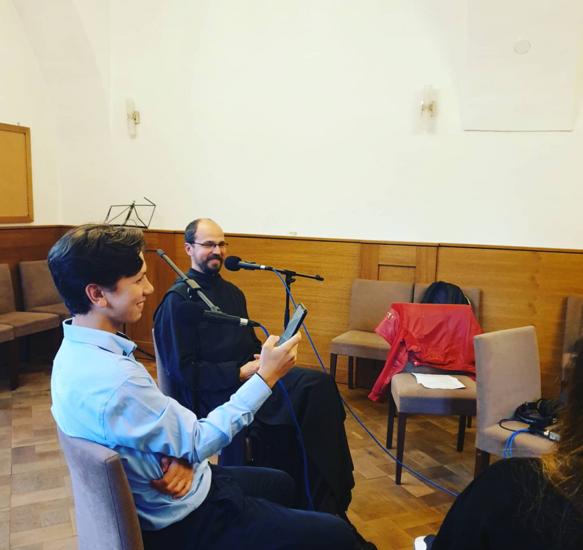 A nyolcadikos Békés-Varró Lilit és a tizenegyedikes Feczkó Csongort érdekelte, milyen a kamerának „misézni”. Izsák atya szerint még nincs végiggondolva az online misézés hatása és a hívek részvétele, de ahol szentmisét ünnepelnek, ott az egész Egyház, az egész megváltott emberiség jelen van. A papnak az a dolga, hogy engedje, hogy rajta keresztül működjön az Isten. János testvér szerint nagyon nem ugyanaz az élmény, ha a templomban vagy a nappalidban követed a szentmisét. Pár éve ő maga is az otthonában, Bakonybélben vett részt lelkigyakorlaton. „Közben átvettem egy számlát öt kiló karfiolról, megláttam egy könyvet, amit rég vissza kellett volna már adni, vagyis minden adott volt, ami elvonja a figyelmemet.”