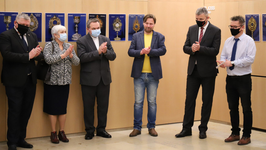 A fotóművész sötétkék háttér előtt készített fényképeket szentségtartókról a Pécsi Egyházmegye horvátok lakta településeinek templomaiban, ahol horvát nyelvű szentmiséket mutatnak be.