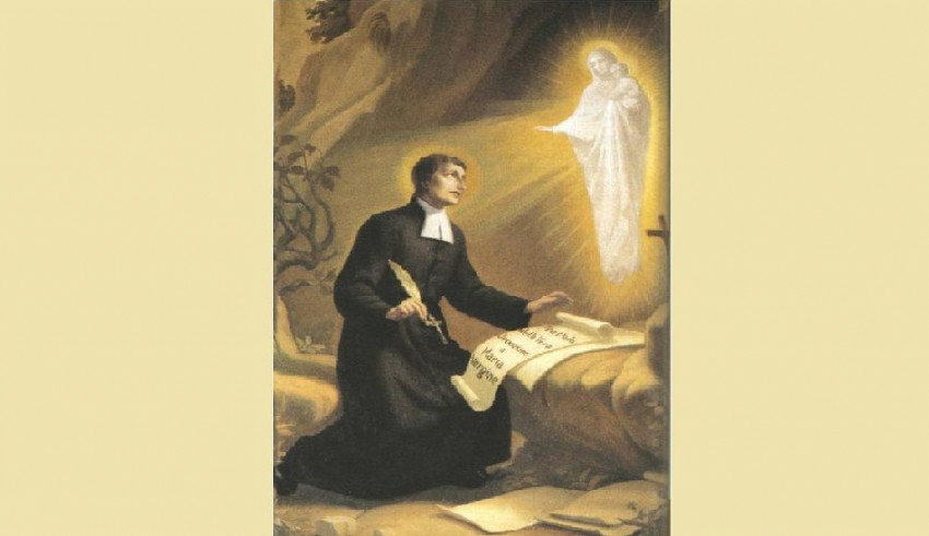 A francia szerző (1674–1716) egy tizennyolc gyermekes családból származik, a testvérek közül hárman papok lettek, ketten pedig apácák. Lajos gyermekkorától kitűnt lángoló Mária-tiszteletével. Már öt-hat éves korában naponta elmondta a rózsafüzért. 1700-ban, pünkösd hetében szentelték pappá.