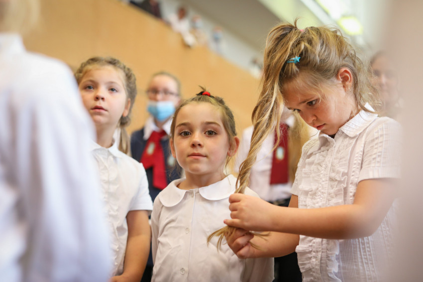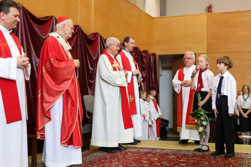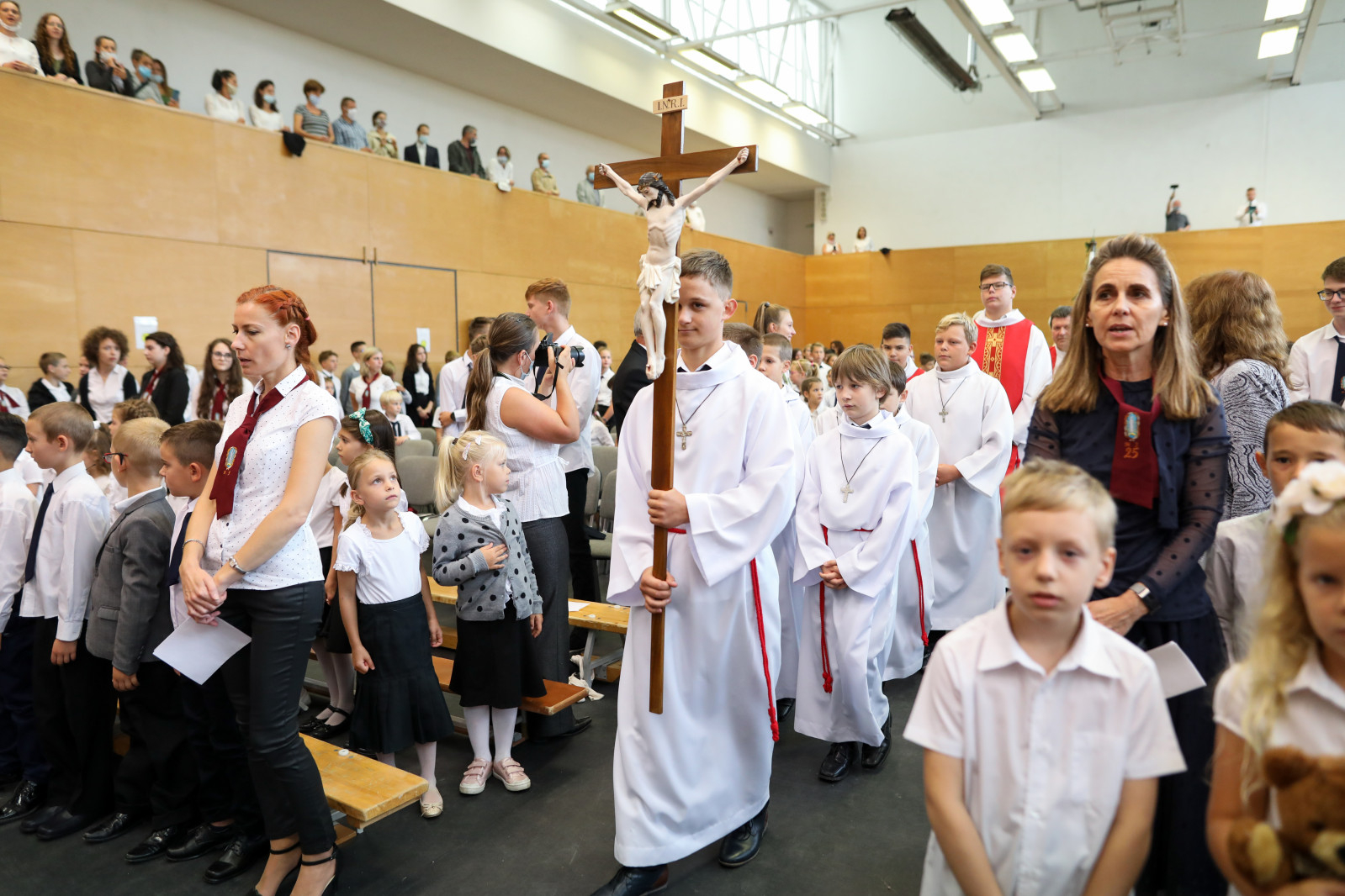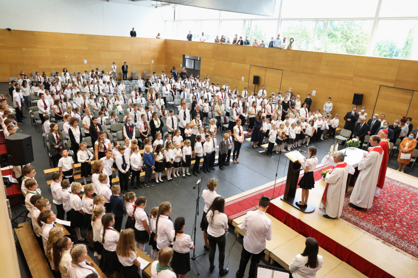 A szentmise elején Espasa-Sancho Ramon, a Mindszenty-iskola igazgatója felkötötte az iskola zászlójára a 30. jubileumi tanév szalagját. A bevezetőben Erdő Péter szólt a gyerekekhez: Nehéznek ígérkező tanév kezdetén nagy jelentősége van annak, hogy a Szentlélek támogató megerősítését kérjük. Bizonytalan körülmények között kezdünk dolgozni, egészen különleges kihívást jelent ez az elsősöknek, akik előtt most nyílik meg az iskolai élet.