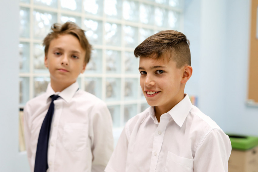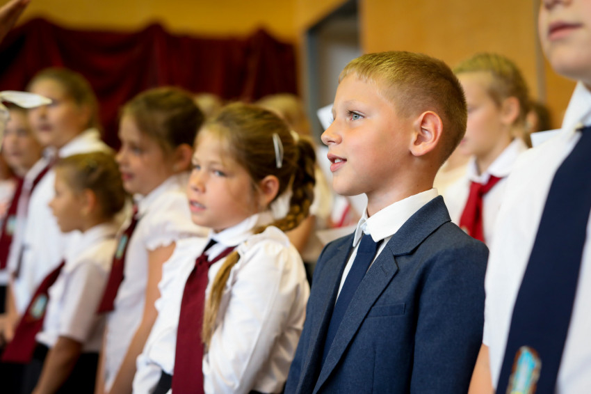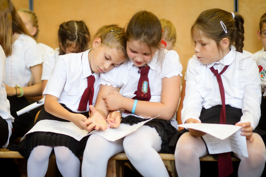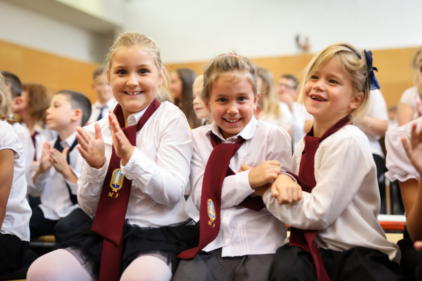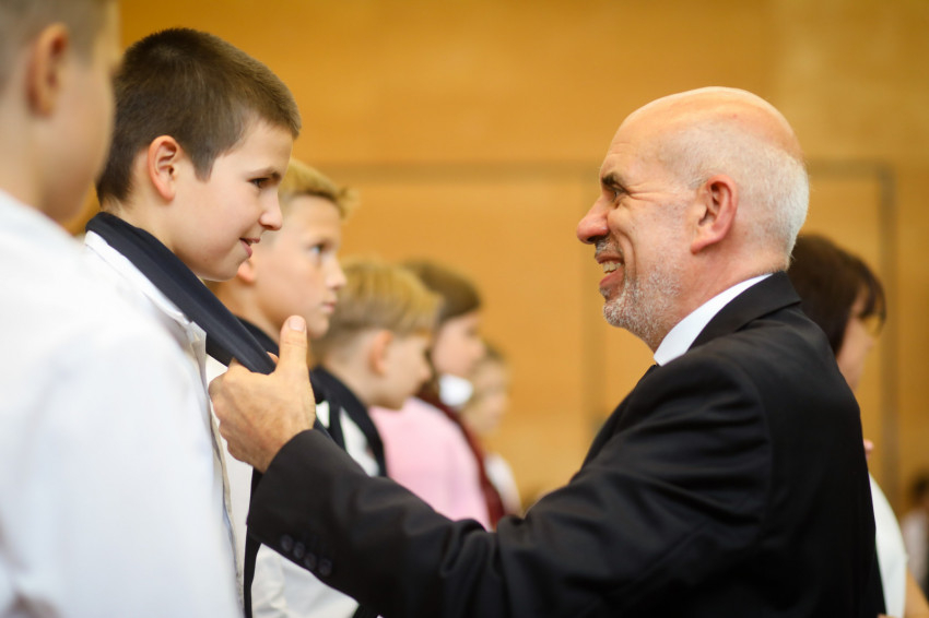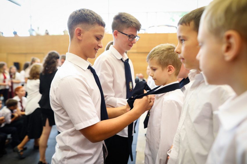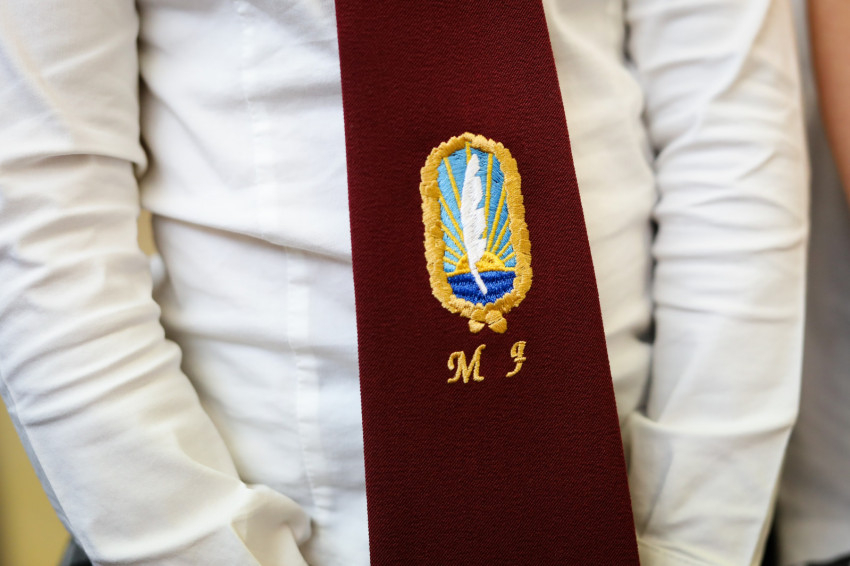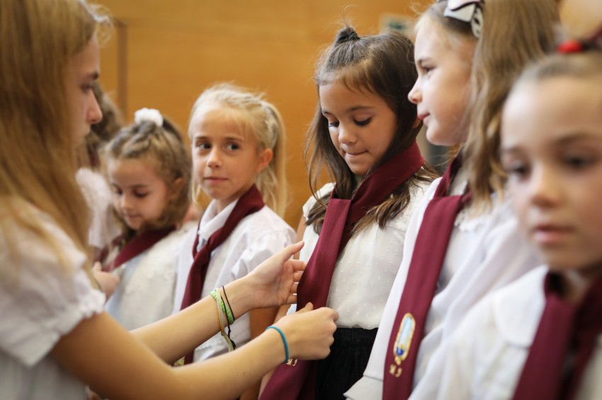 A beszéd után ünnepélyes pillanat következett: A nyolcadikos tanulók átadták az iskola egyennyakkendőjét az elsősöknek. A fiúk kéket, a lányok bordót kaptak. Az új tanulók ugyancsak kaptak nyakkendőt, név szerint hívták őket a dobogóra, nekik Espasa-Sancho Ramon igazgató biztató mosollyal és néhány köszöntő szóval kötötte fel a nyakkendőt. Végül az iskola új és visszatérő tanárai is megkapták a nyakkendőjüket. „Isten hozott mindannyiótokat a közösségben! Érezzétek jól magatokat” – köszöntötte őket az igazgató. A tanévnyitó az iskola himnuszával fejeződött be.