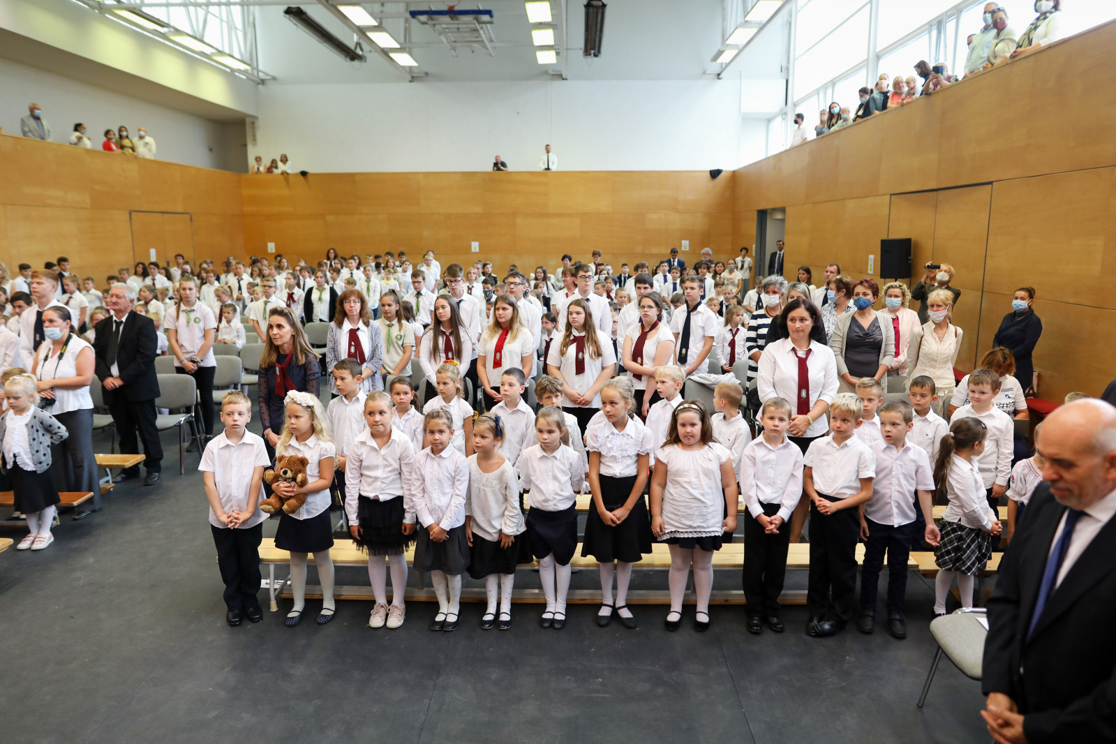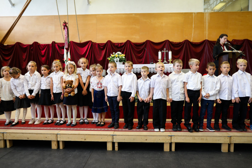 Az alkalomra díszteremmé változott az iskola 2003-ban épült tornacsarnoka. Veni Sanctét ünnepelnek. A tágas térben helyet tudott foglalni a diákság, a tantestület és meghívott vendégek – egykori tanárok, a tagóvoda pedagógusai –, valamint a galérián az elsős gyerekek szülei.