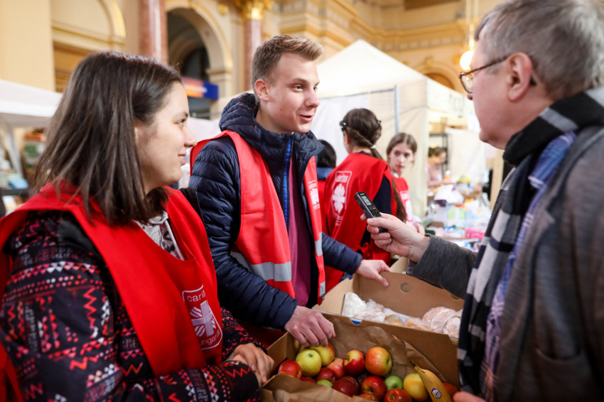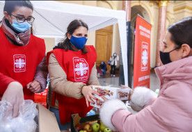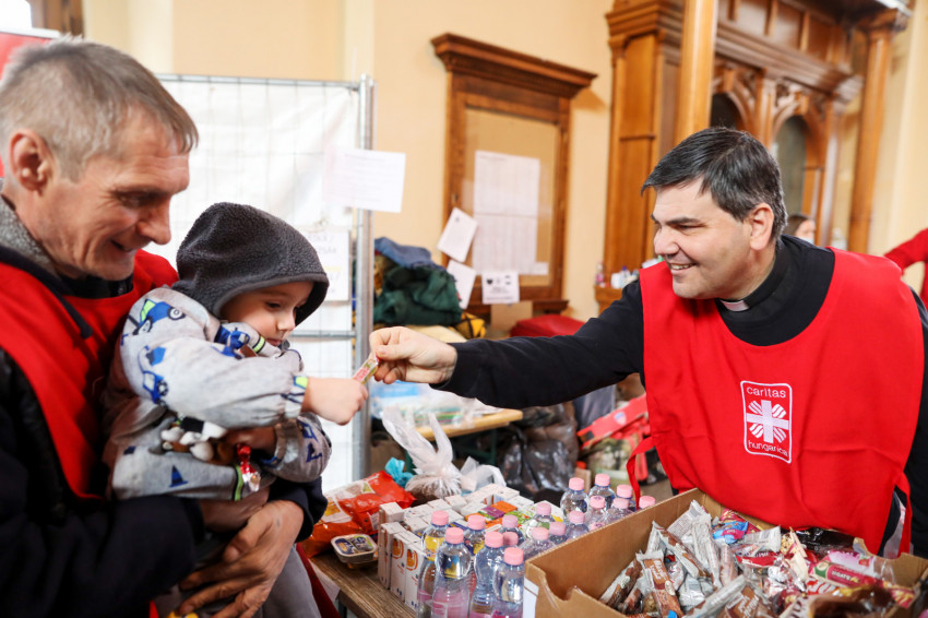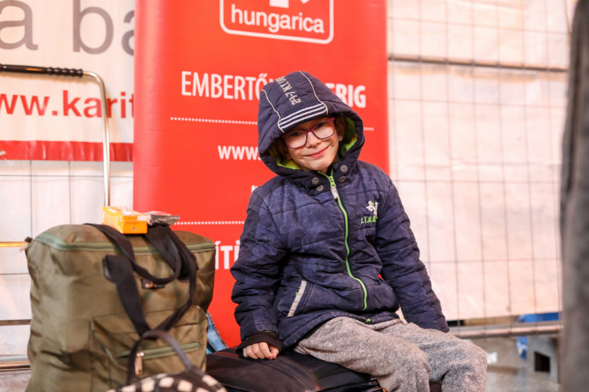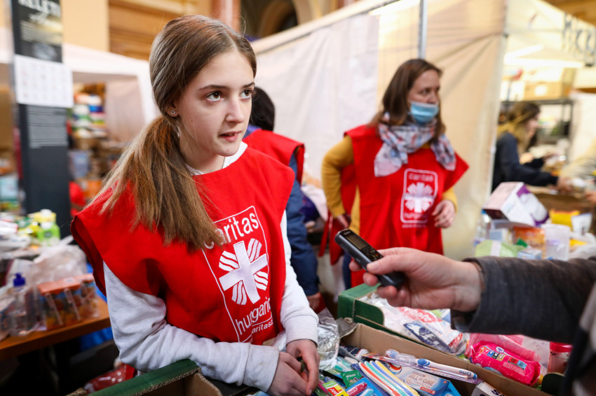 A Katolikus Karitász a háború első percétől kezdve segíti a menekülteket, önkéntesei Budapesten, a Keleti pályaudvaron csaknem két hete vannak kint, most is a Baross térre nyíló váróterem bejáratánál található a sátruk. Rengetegen vannak, menekültek, önkéntesek, segítők, adományozók, a pulton és a háttérben is konzervek, édességek, ásványvizek, tisztítószerek.