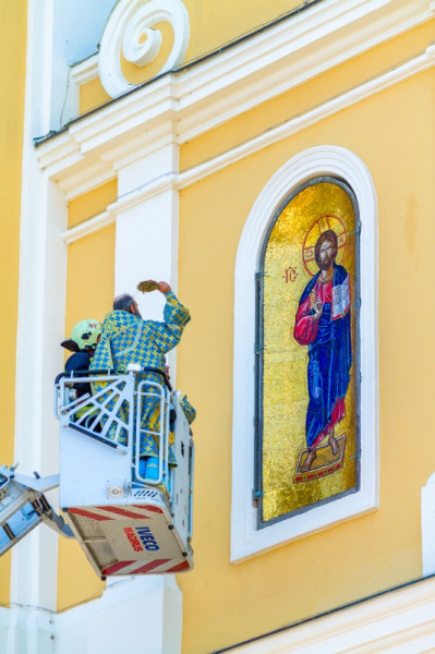 Az alkotás elkészítése közel egy évet vett igénybe. A mozaik egy külön erre a célra készített könnyűszerkezetű betonfülkébe került, a Krisztus-képet a pontosan ütemezett munka eredményeként közvetlenül Nagyboldogasszony ünnepe előtt, augusztus 14-én helyezték föl.