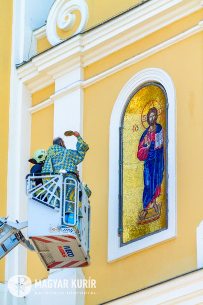 Egy magát megnevezni nem kívánó nagylelkű adományozó jóvoltából gondolhatott arra a kegyhelyigazgató, Kapin István, hogy időtálló, a kegyhelyhez méltó alkotás díszítse kívülről is a basilica minor rangot viselő templomot. Kisléghi Nagy Ádám festőművész Krisztus-ikonját Bukta Norbert festőművész és műhelyének munkatársai rakták ki muranói színes üvegből a bizánci mozaiktechnika módszerével. A Tanító Krisztus nyitott könyvet tart a kezében, amelyen rövid felírás olvasható: „Jöjjetek, Atyám áldottai!”
