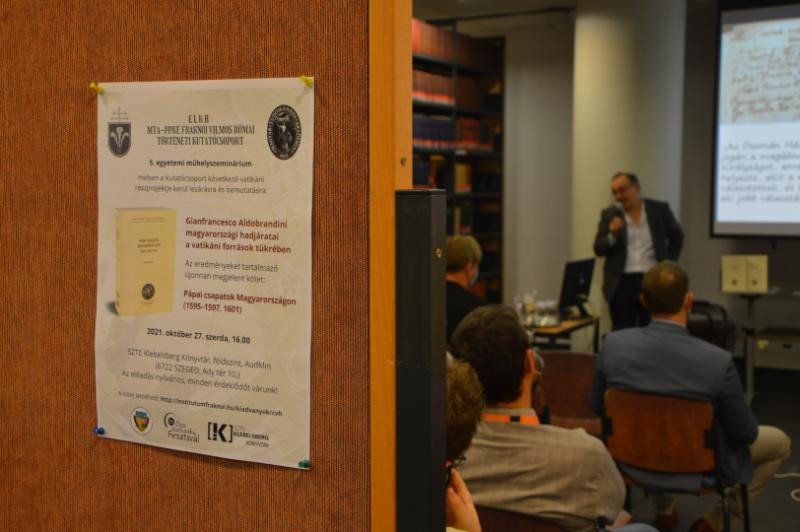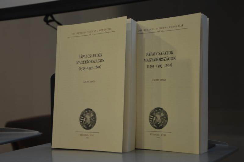 Ez alkalommal Kruppa Tamás, a kutatócsoport tudományos főmunkatársa mutatta be a Gianfrancesco Aldobrandini magyarországi hadjáratait vatikáni források tükrében vizsgáló részprojektjének eredményeit, továbbá az ebből született kötetet: Pápai csapatok Magyarországon (1595–1597, 1601).