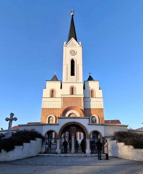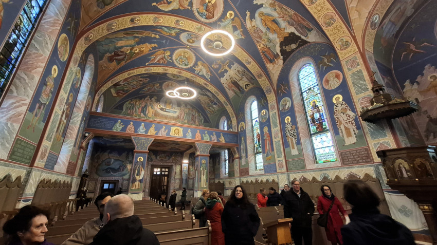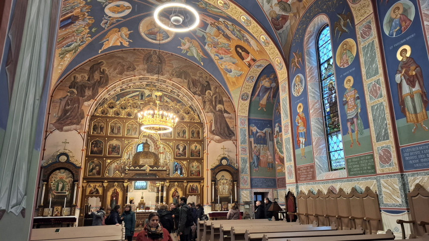 A bejárat felett, az ívekkel övezett kapuzatba szépen beágyazva kör alakú ikon tűnik a szemünkbe: az Istenszülő néz le róla, karjait széttárja. Tőle balra Nagy Szent Bazil, jobbra Aranyszájú Szent János köszönti a hívőket. Nem nehéz rájönni, hogy görögkatolikus templom előtt állunk. Belépve bámulatos belső tér tárul elénk. A hatalmas templom latin kereszt alaprajzú, gyönyörű ikonosztázzal a szentély előtt, hátul pedig karzat magasodik a bejárat fölé. Az épületet a kedvünkért teljesen kivilágították, így valamennyi részletét jól láthattuk. Minden négycentiméter ki van festve e szakrális térben, csak úgy ragyognak a kék és főleg arany színben pompázó szentek és a képek hátterei. Azt mondhatom, egyszerűen fantasztikus élmény bejönni ide és körülnézni. A liturgikus térben körben a falakon és a színes ablakokon az evangélium jelenik meg. Aki nem olvasta a Szentírást, annak számára is jól követhető az üdvtörténet a születéstől a kereszthalálon át a feltámadásig és az elszenderülésig.