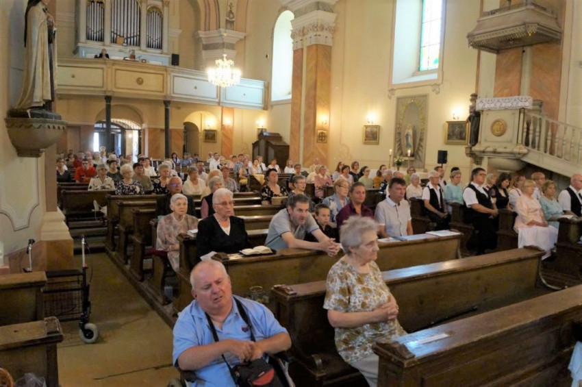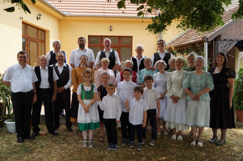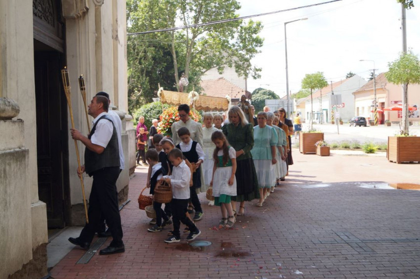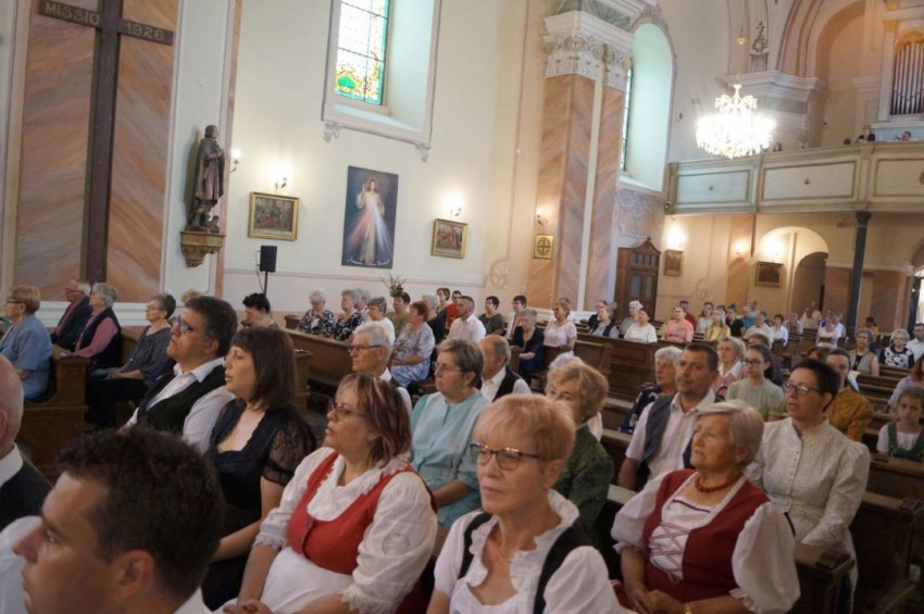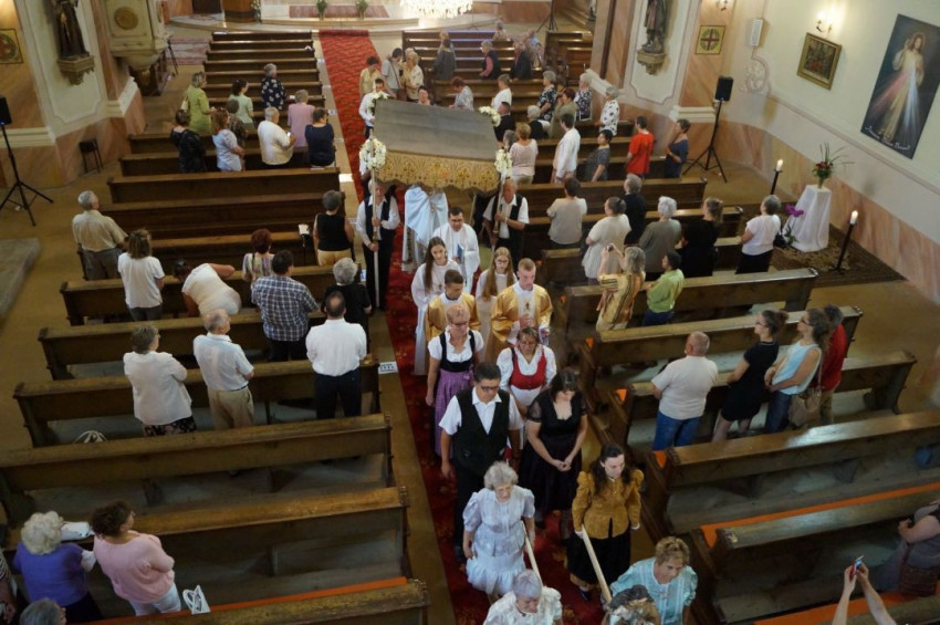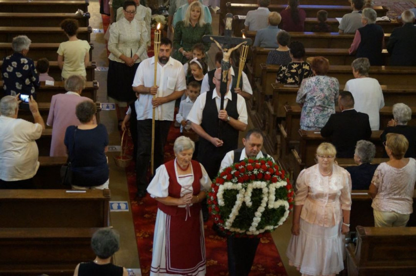 A búcsúi szentmise körmenettel zárult – az eleki és az almáskamarási közösségek német nemzetiségű, népviseletbe öltözött tagjai vitték a Boldogságos Szűzanya szobrát és kísérték az Eucharisztiát az ünneplőkkel együtt.