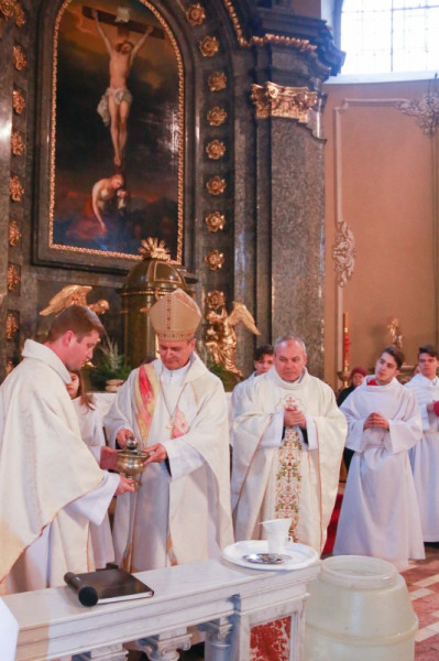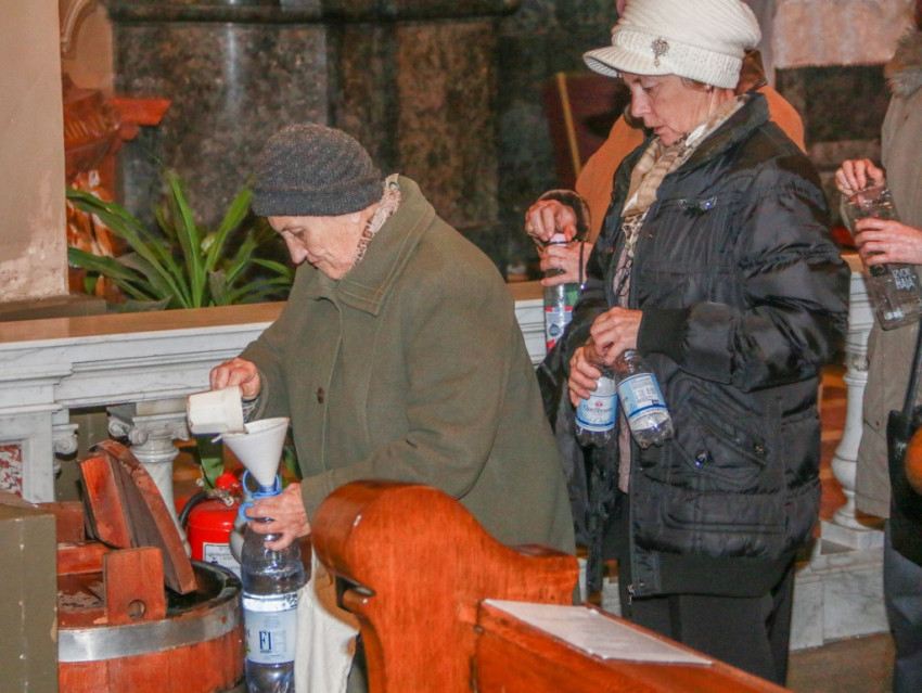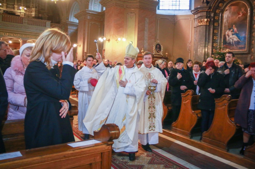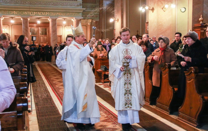 Vízkeresztkor régi hagyomány szerint a katolikus templomokban vizet szentelnek, amivel a papok meghintik a híveket, akik vesznek a vízből, és magukkal viszik otthonaikba. Schönberger Jenő püspök a bevonulást követően megáldotta a sót, amit a vízbe öntött. Megáldotta a vizet is, majd meghintette vele a híveket, a keresztségükre való emlékeztetésként.