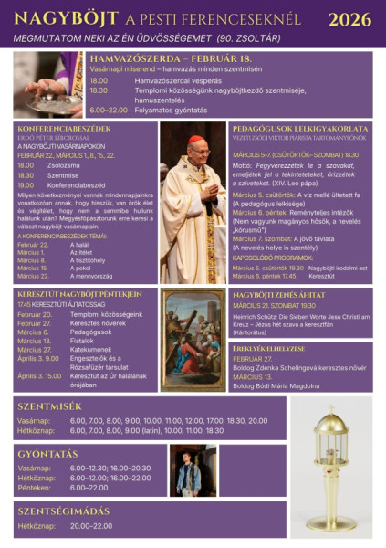 A további nagyböjti programok és liturgikus események részletei olvashatók a plakáton, valamint a pesti ferencesek honlapján.