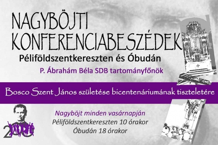 „Elmélyítve Don Bosco ismeretét, valósítsuk meg ma is az Ő lelkületét!” – e gondolat jegyében hangzanak el a nagyböjti vasárnapokon Péliföldszentkereszten a 10 órai szentmise, Óbudán pedig a Segítő Szűz Mária szalézi kápolnában (1032 Budapest, Bécsi út 175.) a 18 órai szentmise keretében azok a konferenciabeszédek, amelyeket Ábrahám Béla SDB tartományfőnök a szalézi rend alapítója tiszteletére tart. A konferenciabeszédekből különböző nézőpontokból ismerhetjük meg a 19. század nagy szentjének lelkiségét.