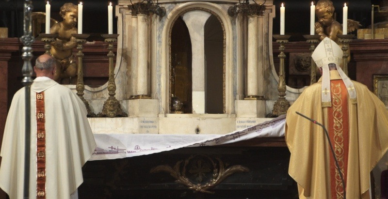 Krisztus egyszeri keresztáldozatát az egyház minden egyes szentmisében jelenvalóvá teszi. Nem megismétli, nem megsokszorozza, hanem jelenvalóvá teszi lényegi valóságában és kegyelmi erejében – fogalmazott szentbeszédében Erdő Péter, hozzátéve: Isten egyidejűsége és egysége fel-felbukkan a tér és az idő egy-egy pontján, amikor a szentmisét ünnepeljük. Ezért mondhatjuk el, hogy minden szentmise végtelen értékű áldozat, emlékezés a történelmi múltra, az örök jelenre és a hívogató jövőre. És jelenlét, szent jelenlét, amely az eucharisztikus színekben a szentmise után is megmarad, sugározza kegyelmi erejét, és méltó az imádásunkra.