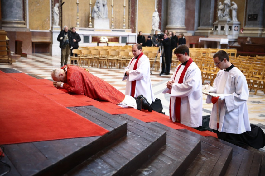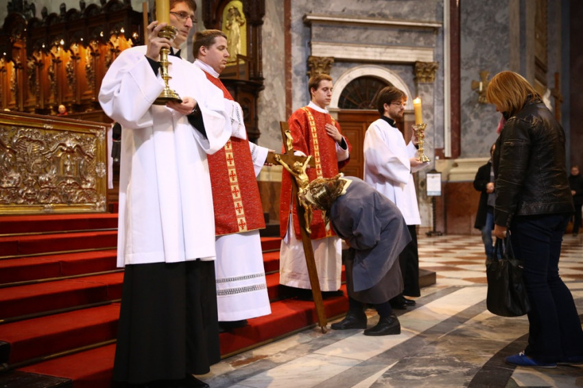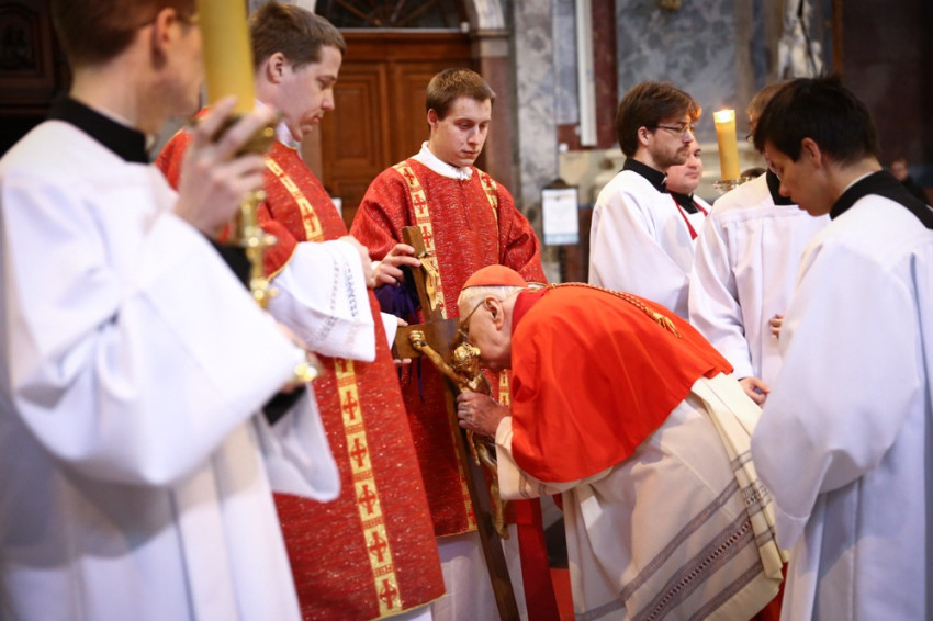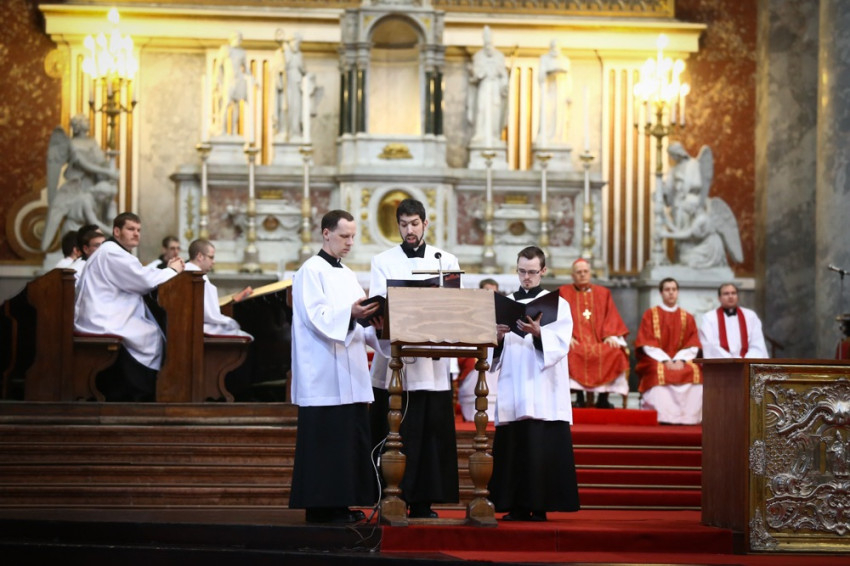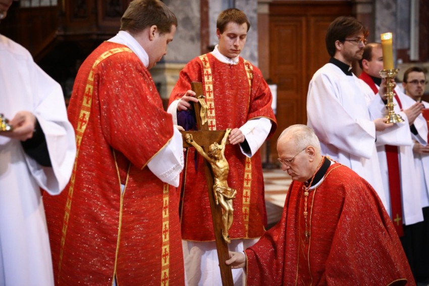 A szertartás kezdetén Erdő Péter bíboros leborult az oltár előtt, majd következett az igeliturgia, melynek részeként a szenvedéstörténetet, a passiót közösen énekelve adta elő a bazilika énekkara és az esztergomi Érseki Papnevelő Intézet növendékei, drámai módon idézve fel Krisztus szenvedését, az Isten irántunk való szeretetének titkát.