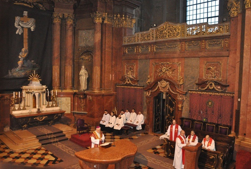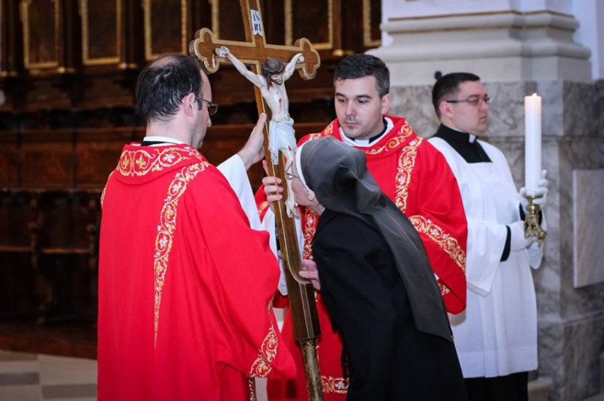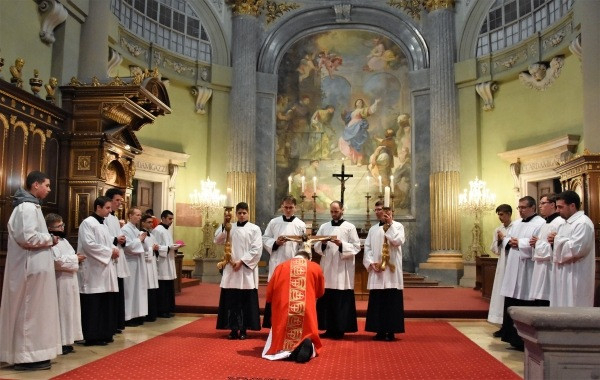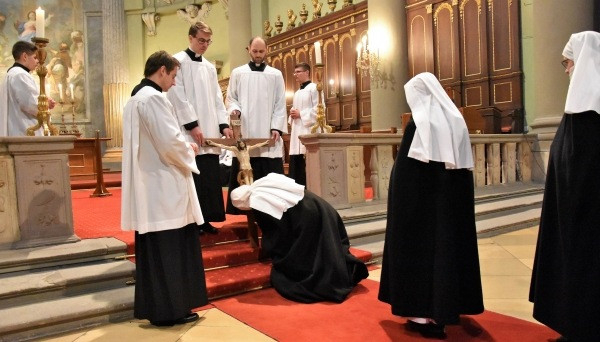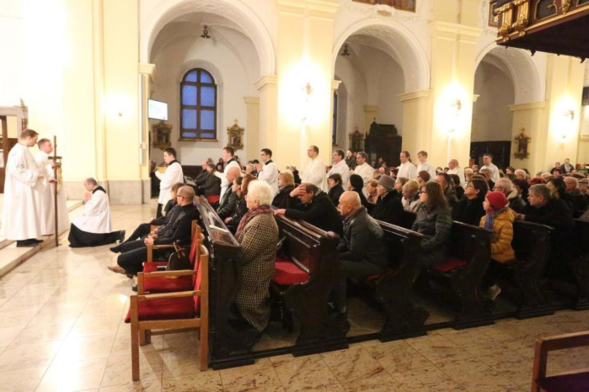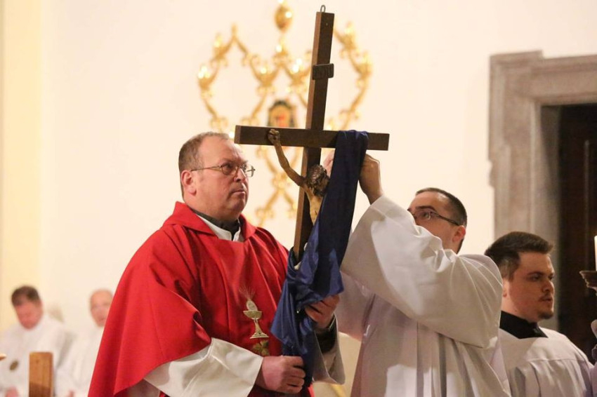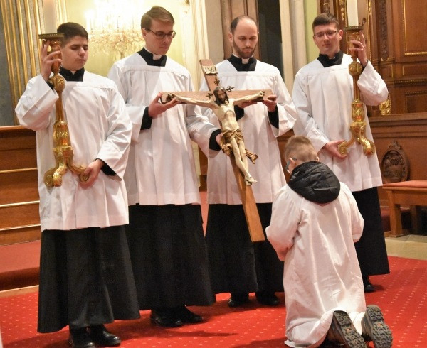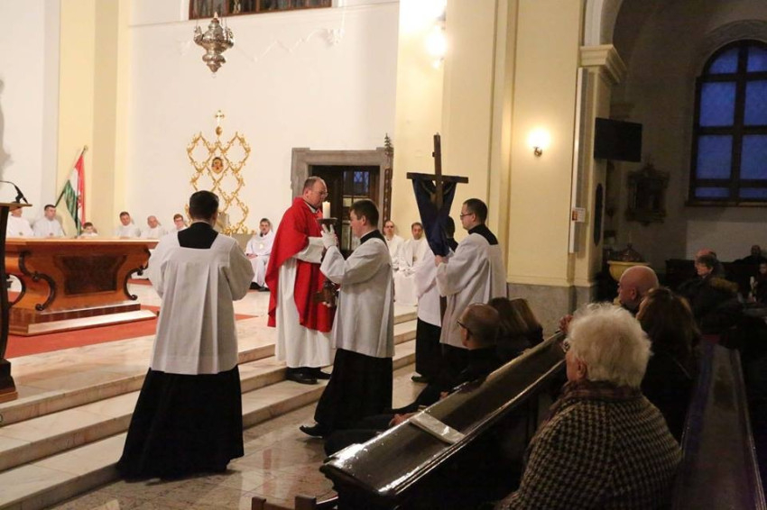 A nagypénteki liturgia a váci székesegyházban a hagyományokat követve csendes bevonulással kezdődött, majd a főpásztor a diakónusokkal leborult az oltár előtt, amelyet nagycsütörtökön minden díszétől megfosztottak. Az oltár most maga a Golgota: lélekben mi is odamegyünk a Golgotához, Jézus keresztjéhez.