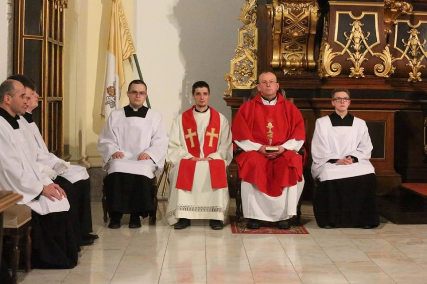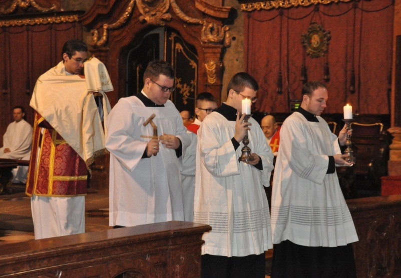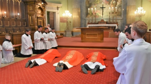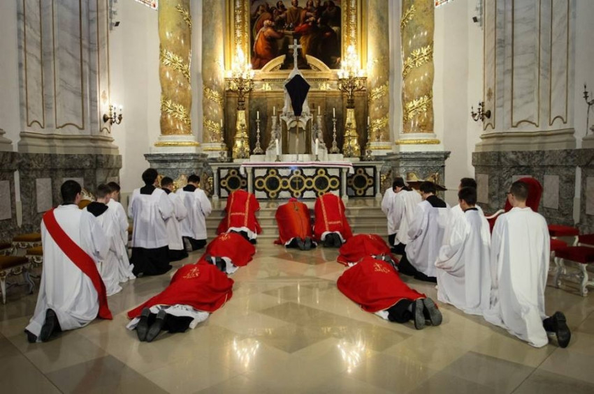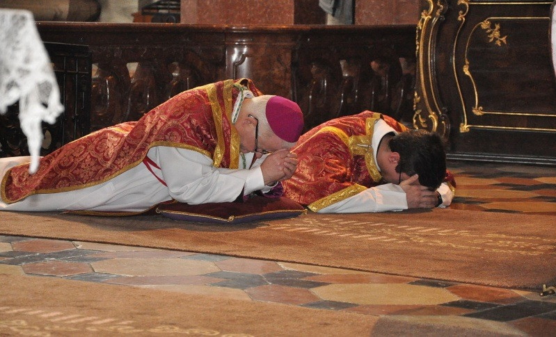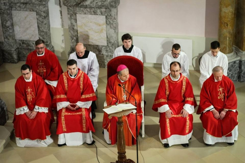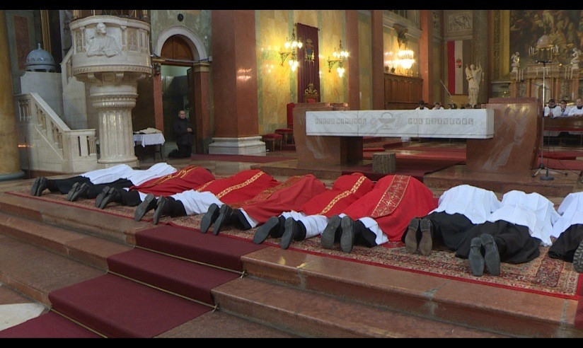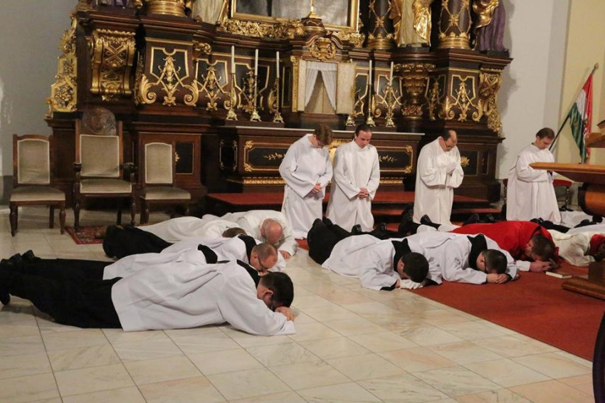 Ternyák Csaba egri érsek és az asszisztencia a vértanúk piros ruhájában vonult az oltár elé és a földre borulva imádkoztak, kifejezve az Isten szeretete iránti alázatot.