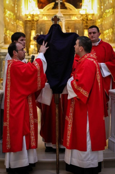 A szertartás az egyetemes könyörgésekkel folytatódott, majd a pap a virágvasárnapon letakart feszületről levette a leplet és kezdetét vette a kereszt előtti hódolat. A szertartás a Miatyánk elimádkozása után az áldozással fejeződött be.